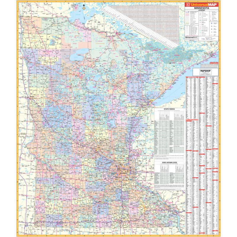 The Minnesota State Wall Map by Kappa Map Group is a comprehensive cartographic tool, providing an in-depth view of the state. This map includes cities and counties indexed on its face for easy navigation. It features color-coded counties and a handy mileage chart to calculate distances between major cities. Detailing all state and federal highways, major waterways, state universities, military installations, major airports, state parks, and wildlife areas, it covers a wide range of geographical and infrastructural elements. Additionally, the map presents cities, towns, and various points of interest across Minnesota, making it a valuable resource for residents, professionals, and visitors seeking detailed geographic information.