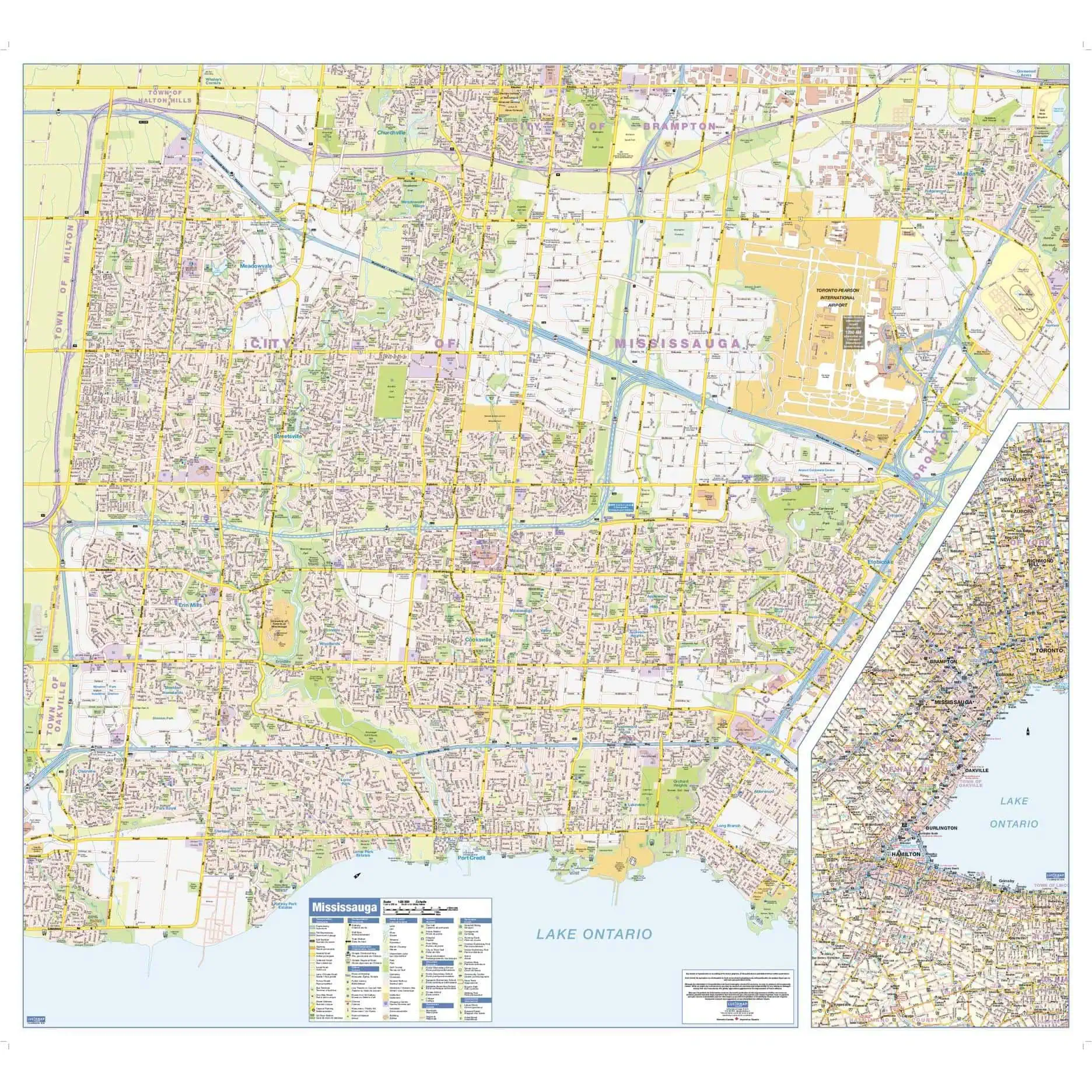 This wall map shows highly detailed local information of the city of Mississauga. Full street labeling along with transit information, parks, schools, churches and landmarks throughout the city are displayed.The map has been designed in a very clear and legible manner with a traditional Canadian street map style embraced by map buyers over many years.Â