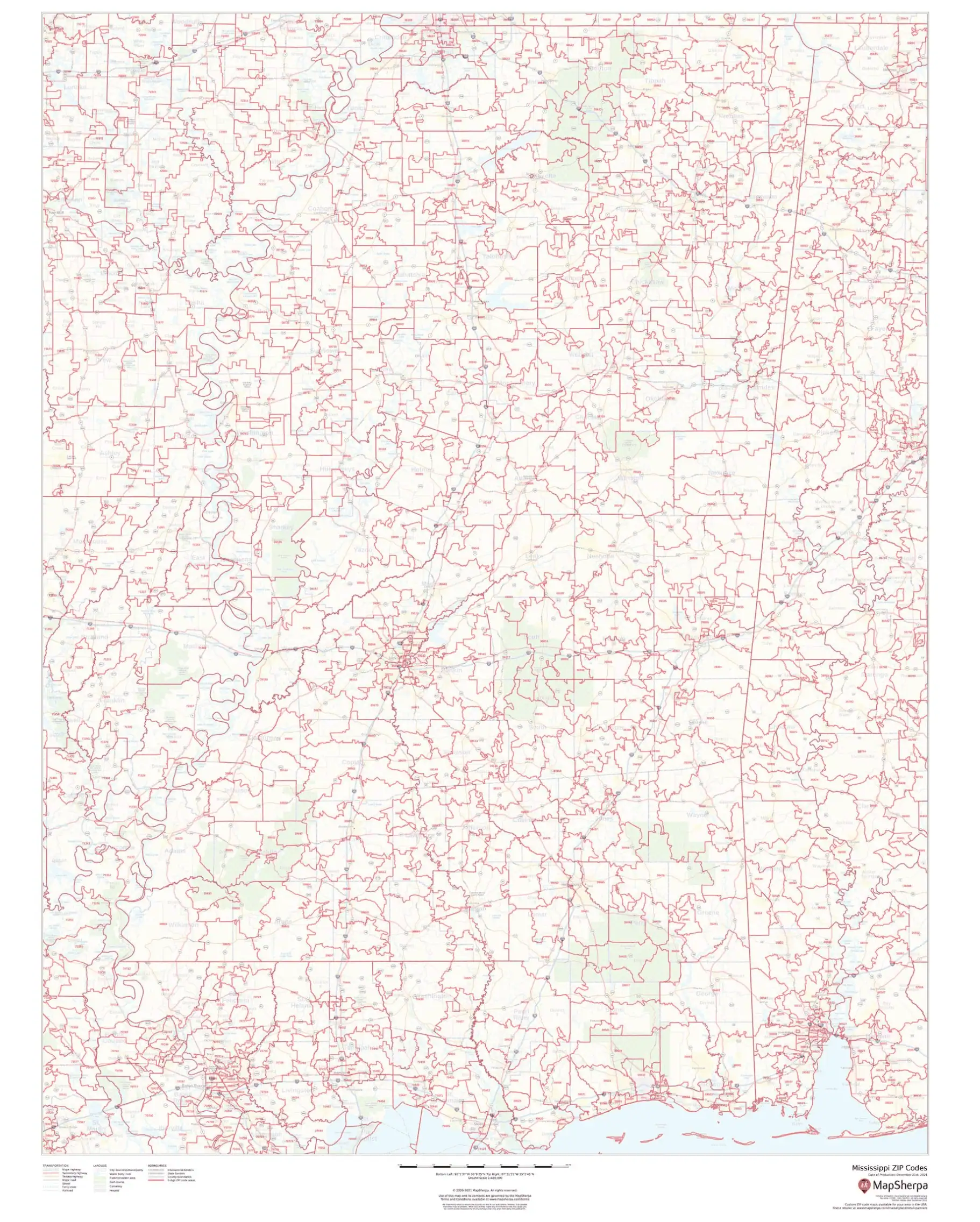 This map of Mississippi shows zip codes overlaid on a road map. Base map features include municipality and county boundaries, major road network features, and state and national parks and conservation areas.