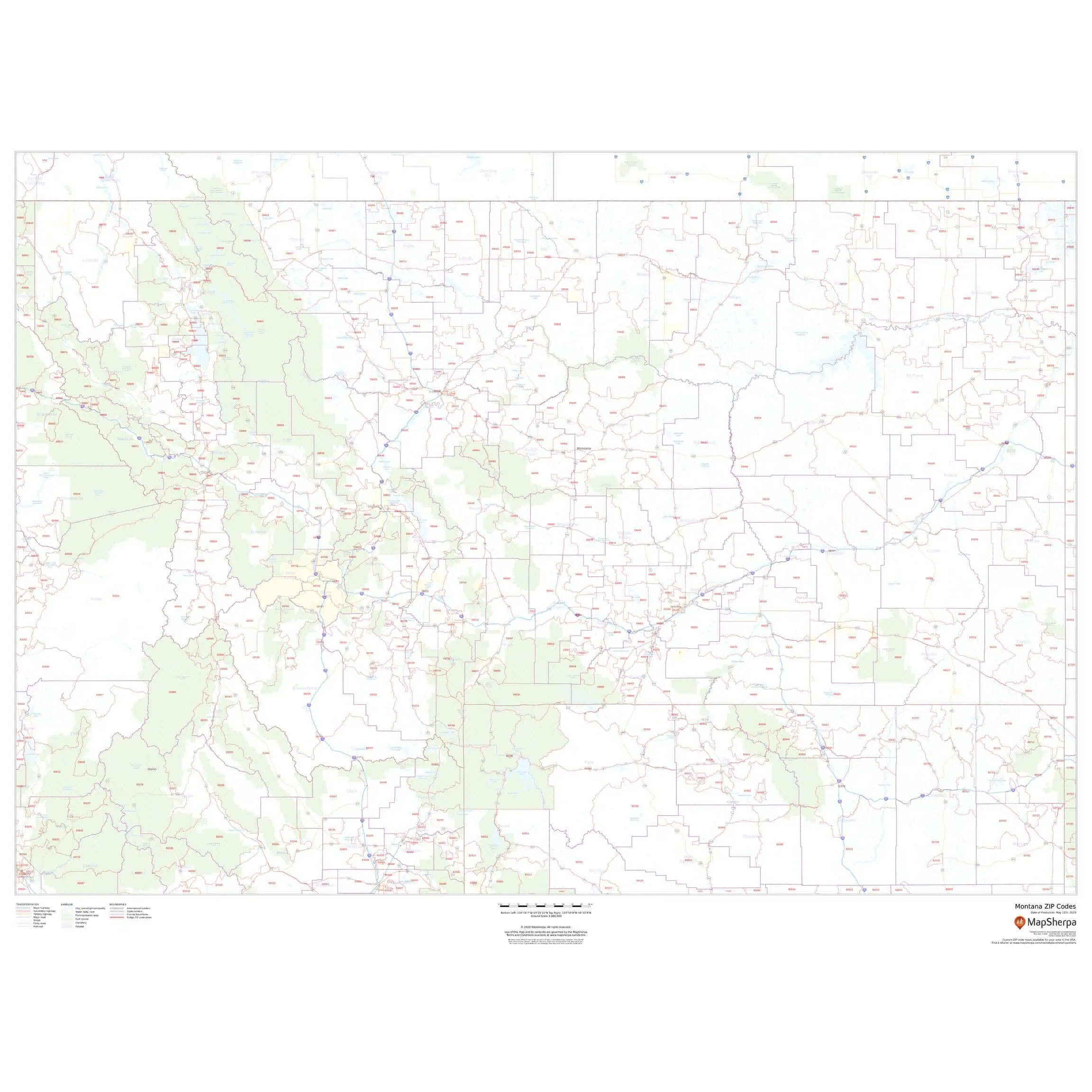This map of Montana shows zip codes overlaid on a road map. Base map features include county boundaries, major road network features, and state and national parks and conservation areas.
