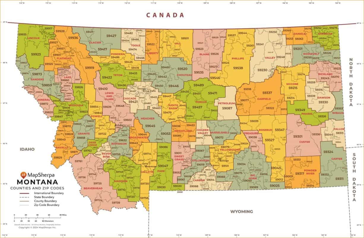 This map has been created exclusively for MapSherpa, and designed for business or reference use. Clear and clean colors & fonts matched with cartographic research makes this map of Montana's counties and ZIP codes easily readable and useful.