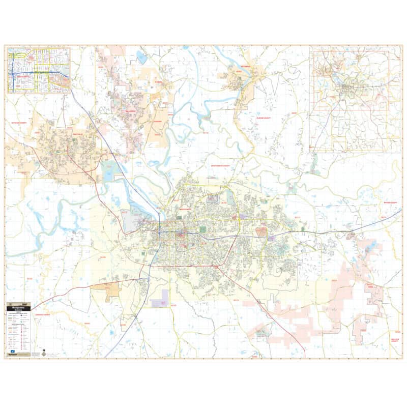 The Montgomery, AL Wall Map and its adjacent areas offer a comprehensive view of the region, featuring complete street detail.