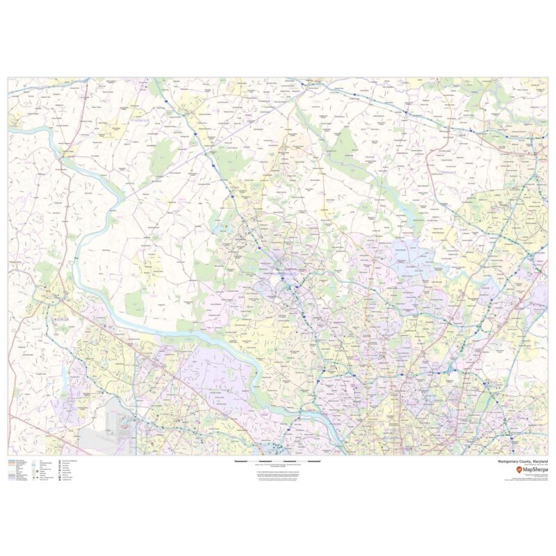 This map of Montgomery County, Maryland shows regional level information. Base map features include highways and major roads with labelling; neighborhood names; railways; high level land use such as parks and recreation areas, industrial areas and hospital campuses; and a selection of points of interest including transportation hubs like airports and train stations, tourist information, police stations and shopping centres. zip code boundaries are shown as a secondary map feature.