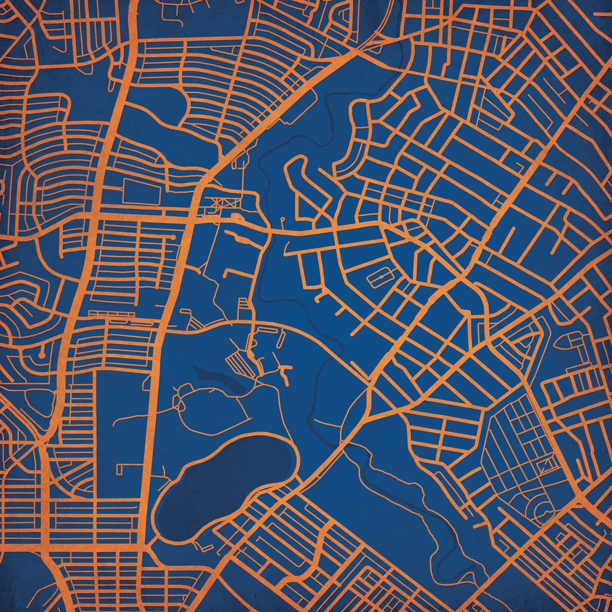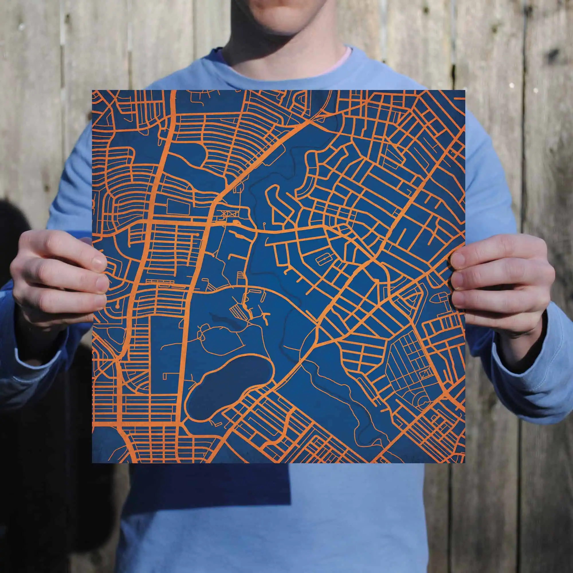 Colorful city map wall art featuring prominent street layouts and urban design, perfect for home or office decor, highlighting city navigation and geographic features.