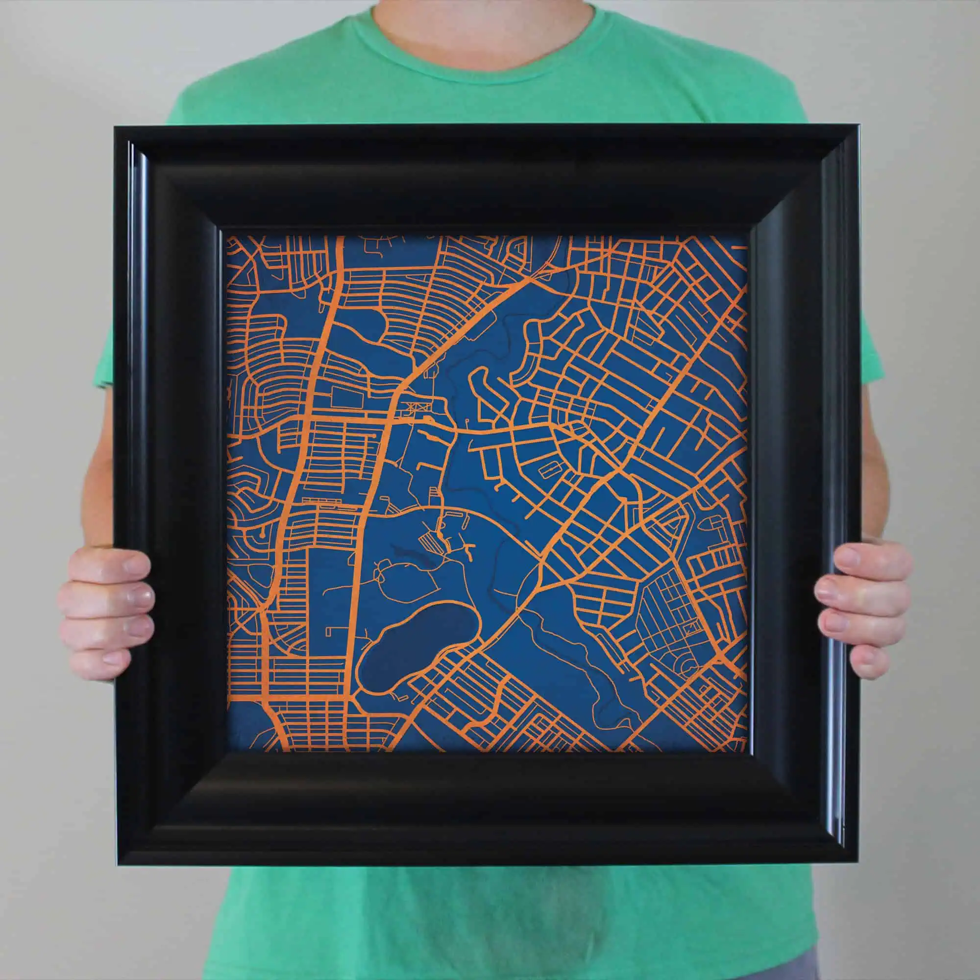 The size of this frame will vary depending on the size of the map you created. Frames are 16.5″ x 16.5″ for 12″ x 12″ prints and frames are 16.5″ x 20.5″ for 12″ x 16″ maps. Our frames have a black 2.75” wide heavy polystyrene molding. We choose to mount the prints without a glass/acrylic overlay, which shows off the unique properties of our paper stock when it hits the light. The back of the frame is sealed with a dust cover for added protection. Industrial silver hanging hardware is fixed to the back of the frame so it’s ready to hang on your wall.