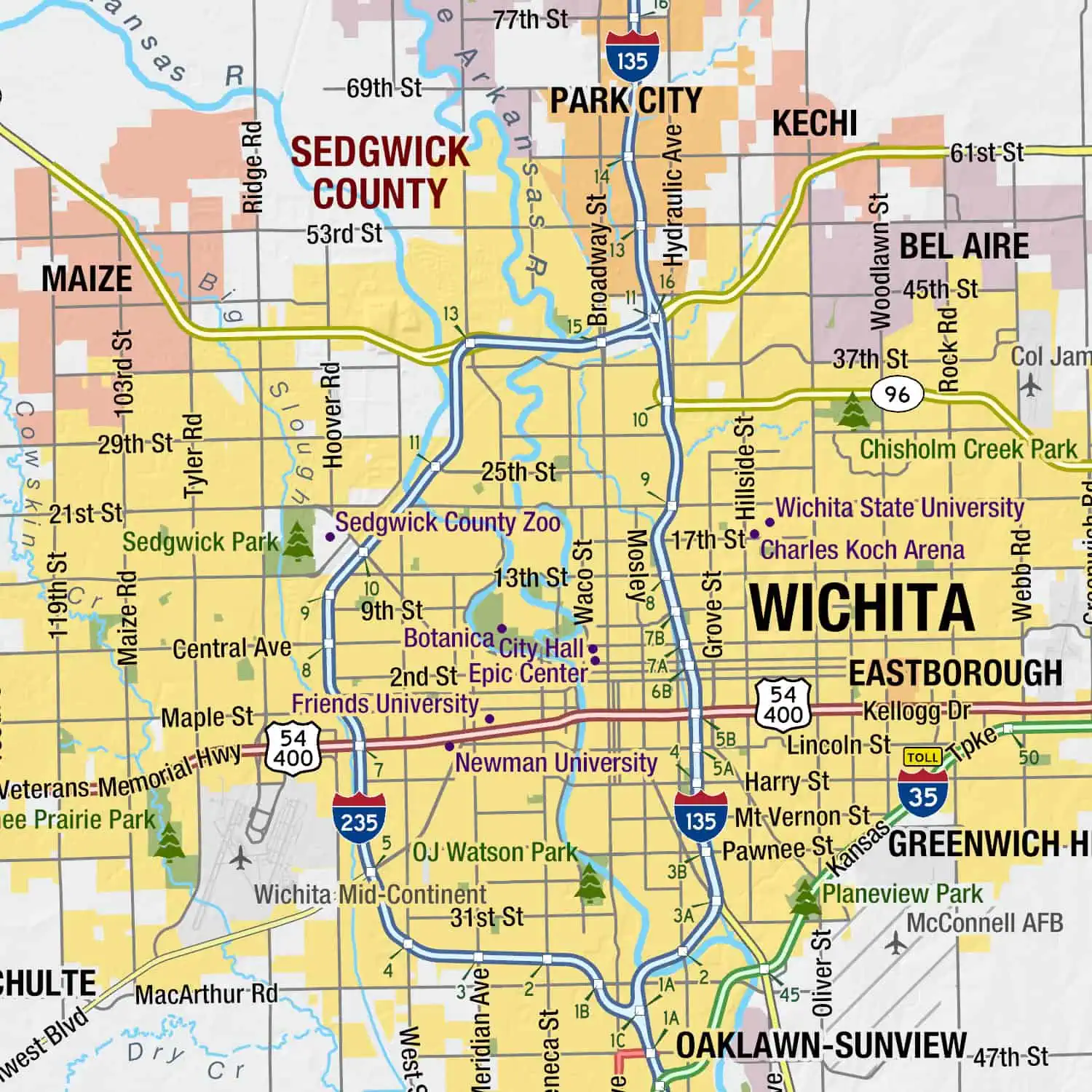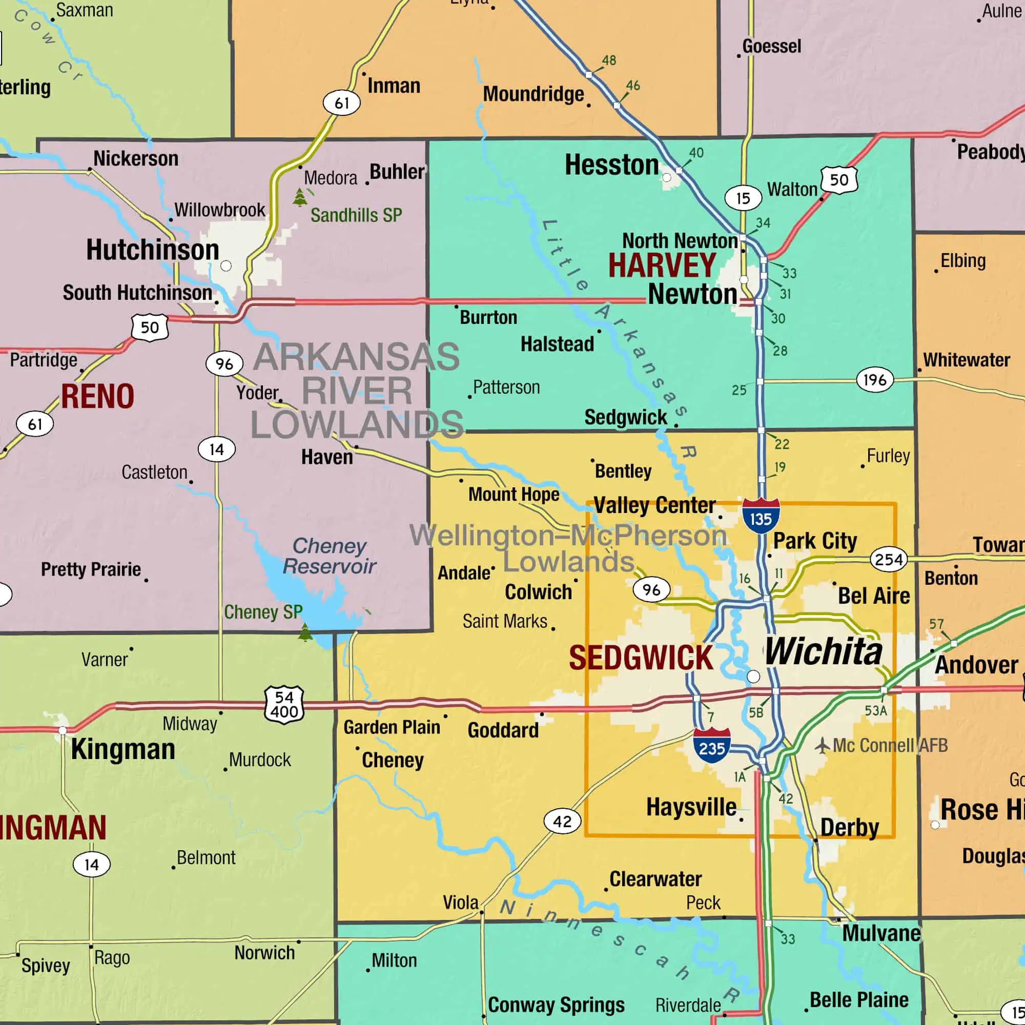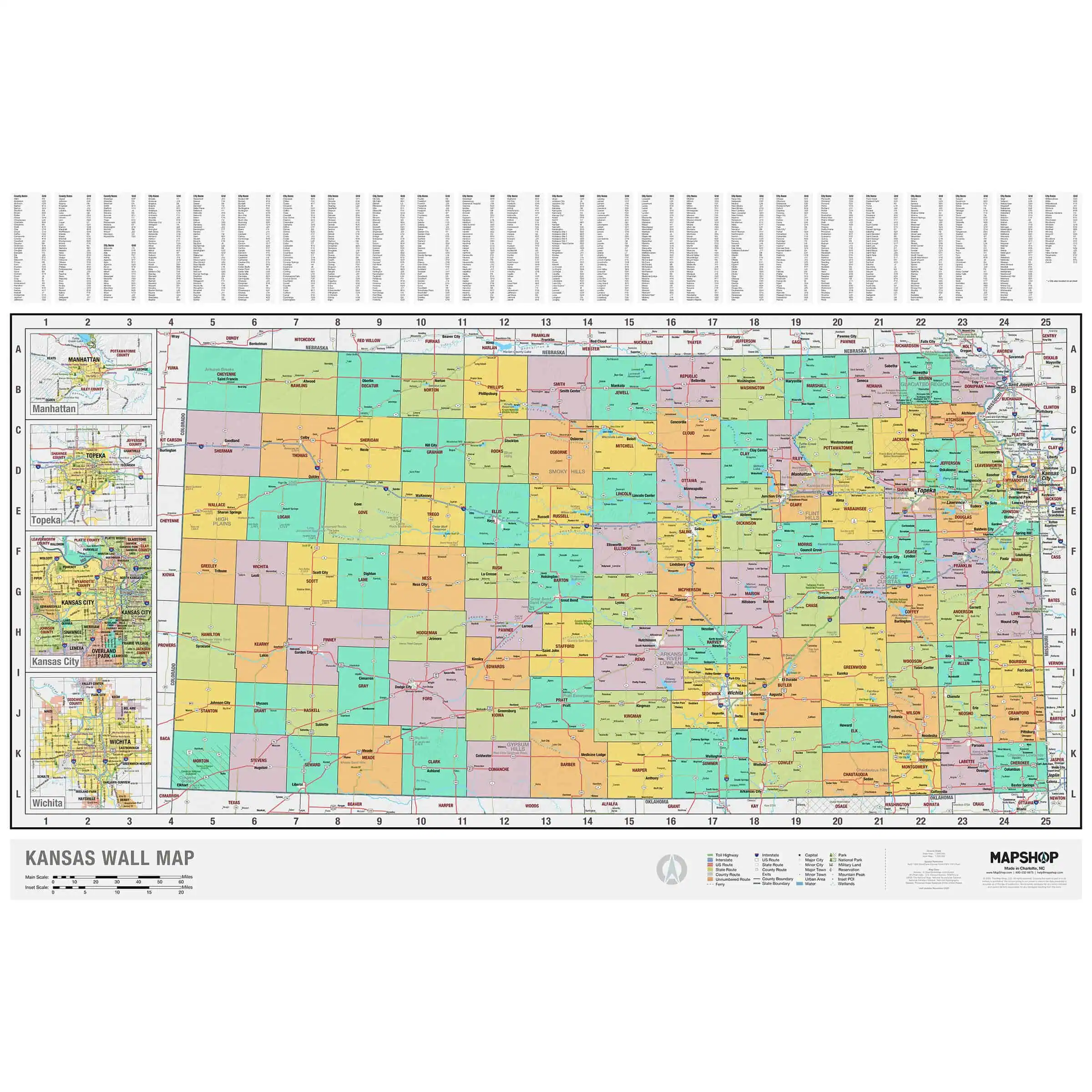 With one of the most all-inclusive Kansas State maps on the market, you can’t go wrong with our wall map for any use. Details on the map include: