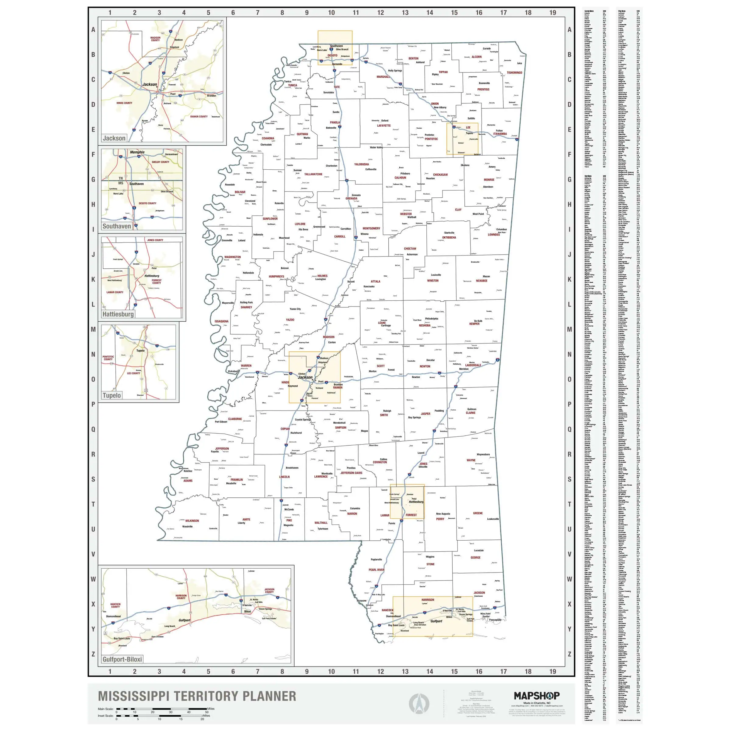 While simpler than the Mississippi State Wall Map, this map is not lacking in any way. Details on the map include: