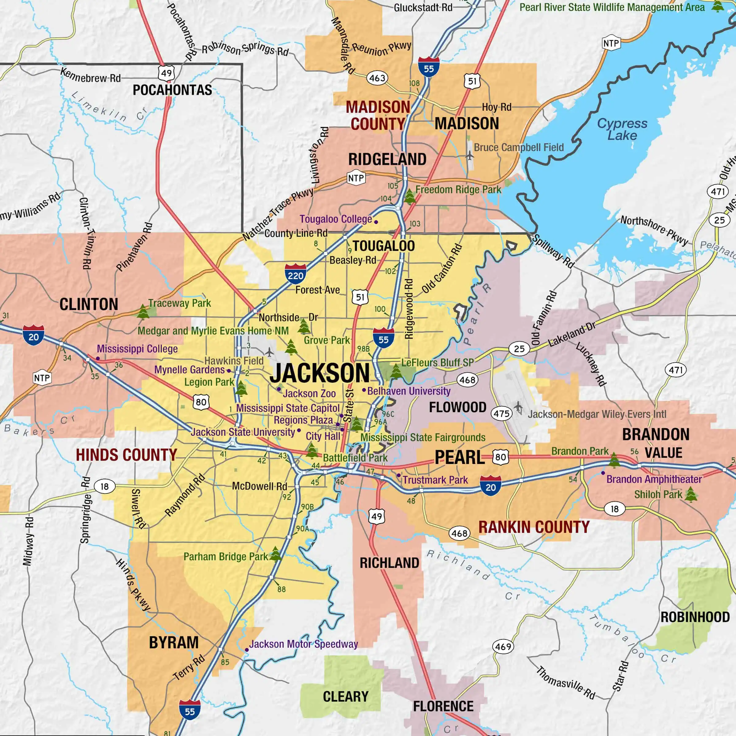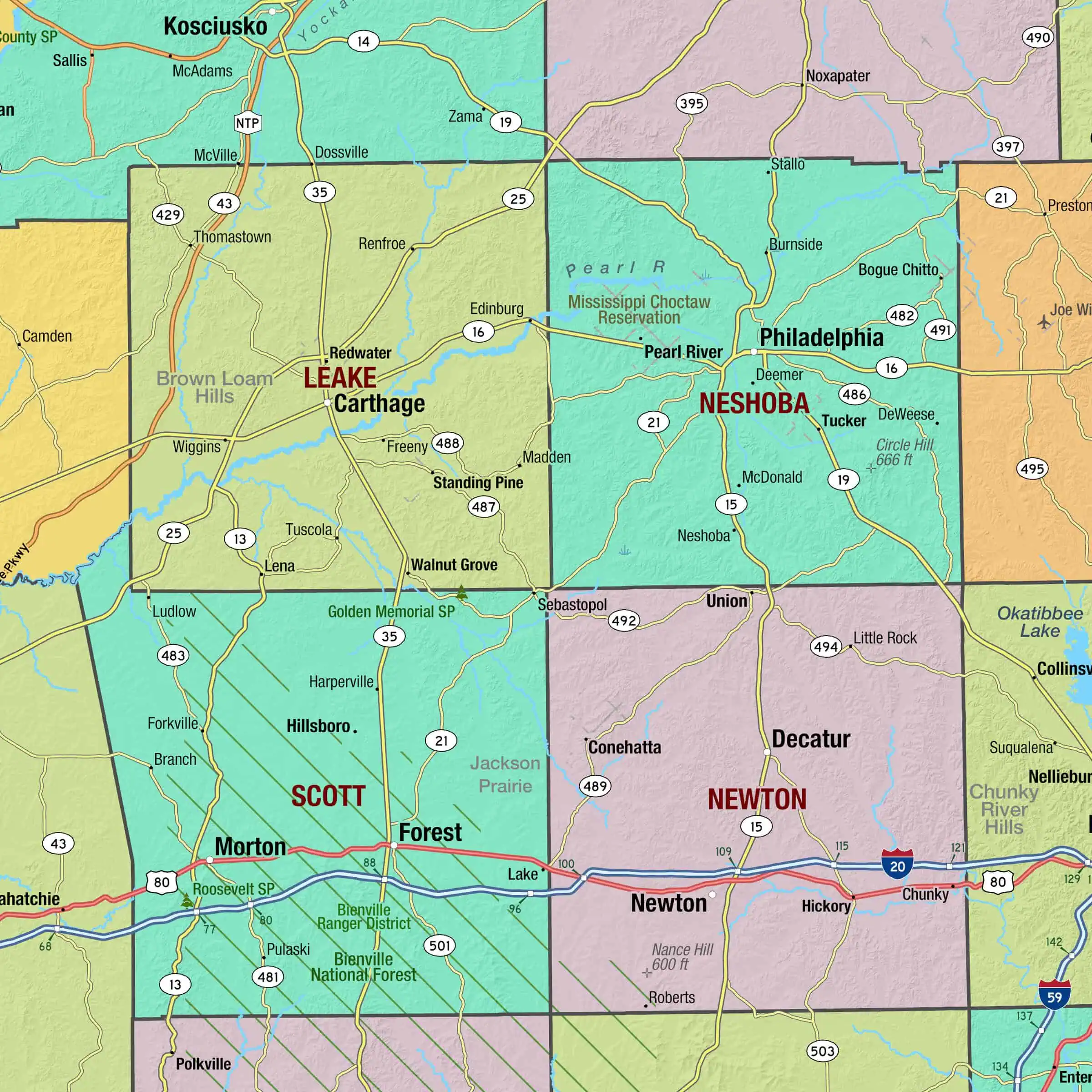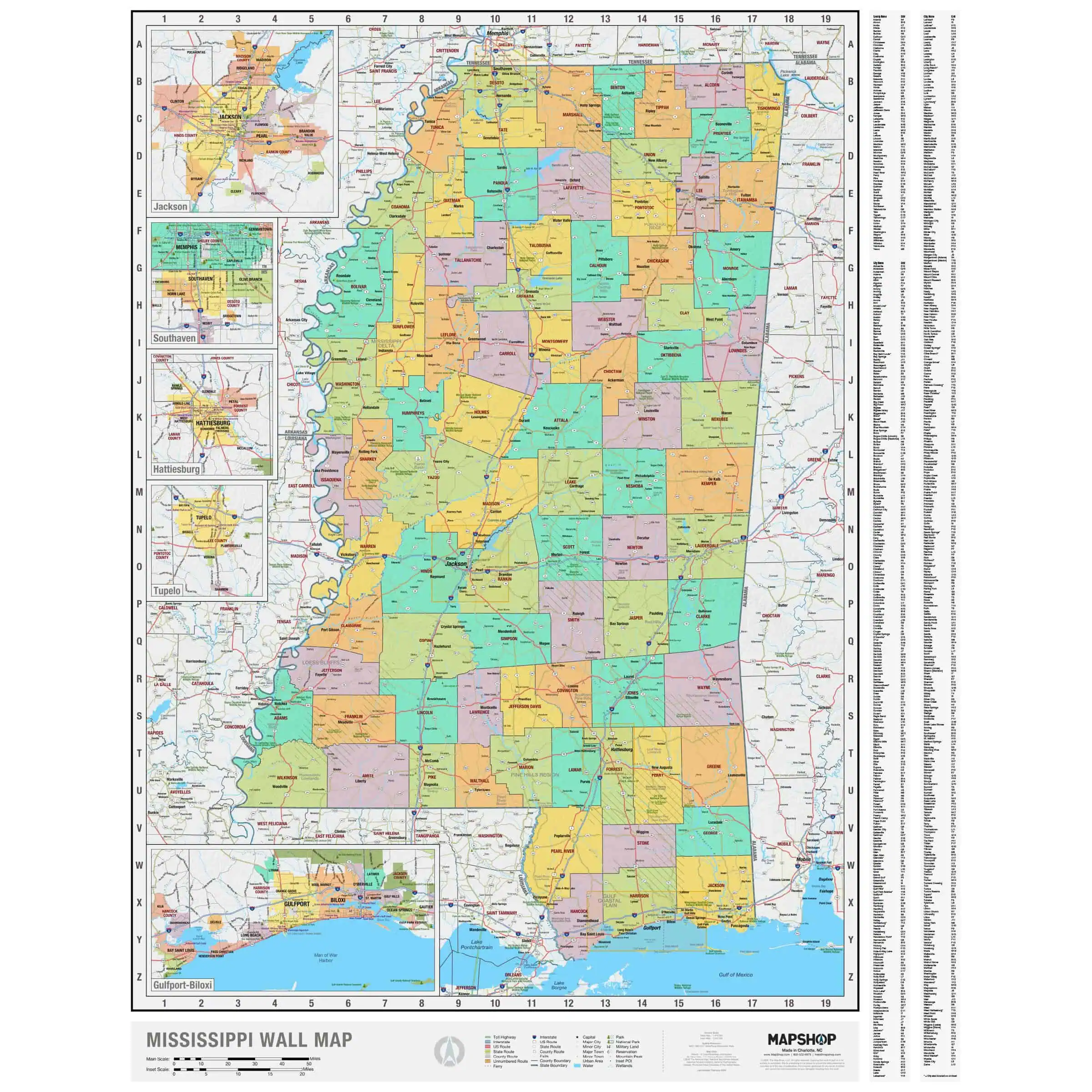 With one of the most all-inclusive Mississippi State maps on the market, you can’t go wrong with our wall map for any use. Details on the map include: