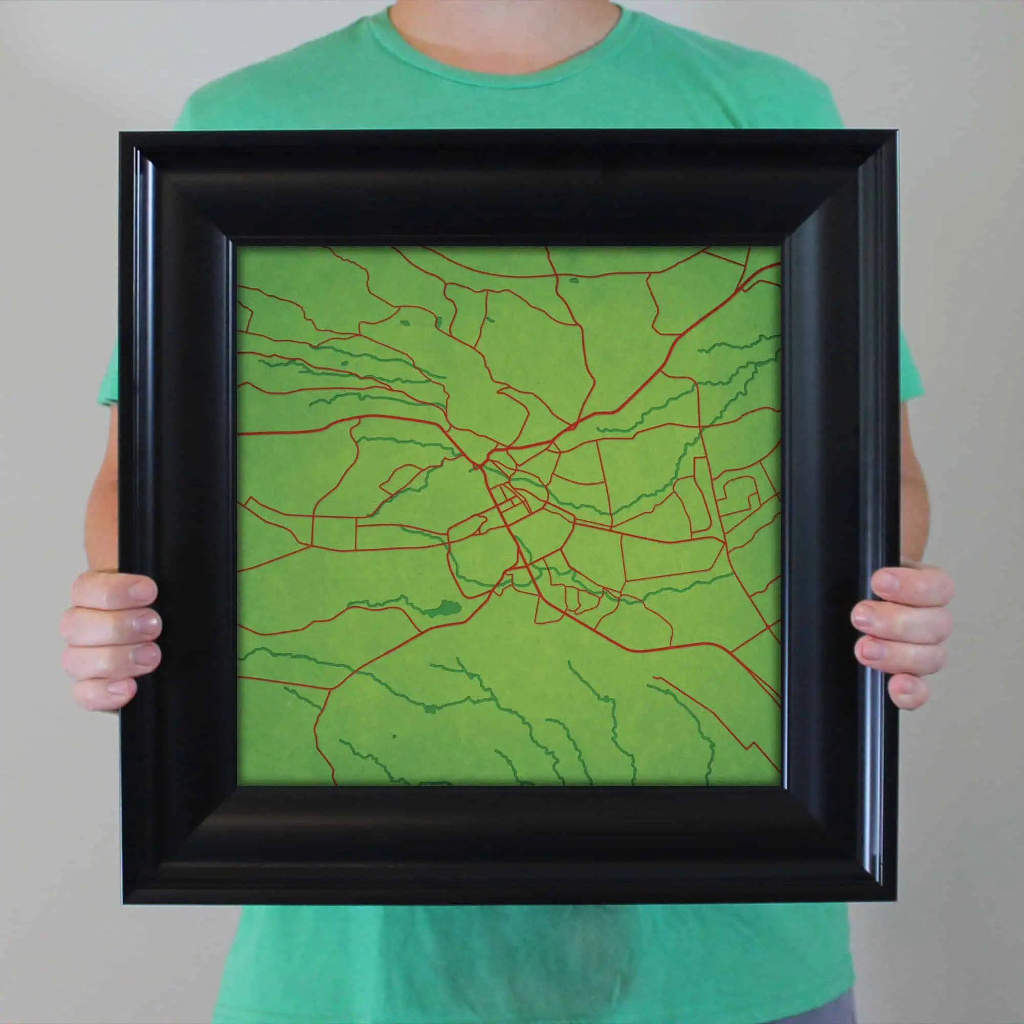 The size of this frame will vary depending on the size of the map you created. Frames are 23″ x 23″ for 12″ x 12″ prints and frames are 15.75″ x 19.75″ for 12″ x 16″ maps. Both frames have a black 1.75” wide genuine-wood molding. The print is enhanced with a soft white acid-free mat, which is bevel cut and placed on top of the print. The print and matt are protected by a premium crystal-clear acrylic overlay. The back of the frame is sealed with a dust cover for added protection. Industrial silver hanging hardware is bolted to the back of the frame so it’s ready to hang on your wall.