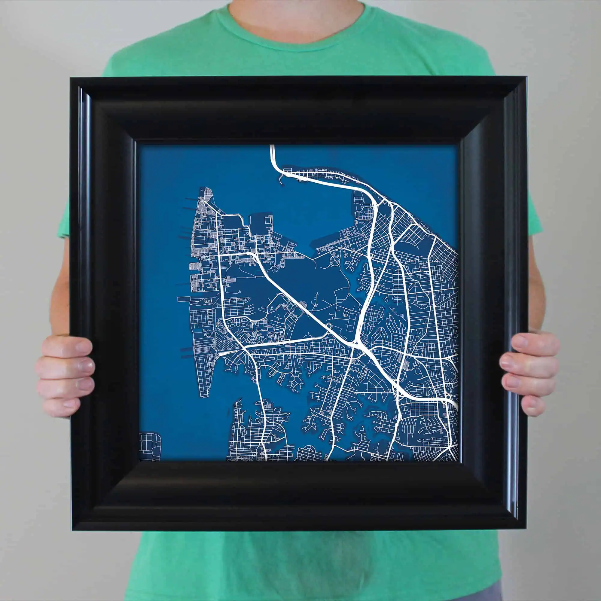 The size of this frame will vary depending on the size of the map you created. Frames are 16.5″ x 16.5″ for 12″ x 12″ prints and frames are 16.5″ x 20.5″ for 12″ x 16″ maps. Our frames have a black 2.75” wide heavy polystyrene molding. We choose to mount the prints without a glass/acrylic overlay, which shows off the unique properties of our paper stock when it hits the light. The back of the frame is sealed with a dust cover for added protection. Industrial silver hanging hardware is fixed to the back of the frame so it’s ready to hang on your wall.