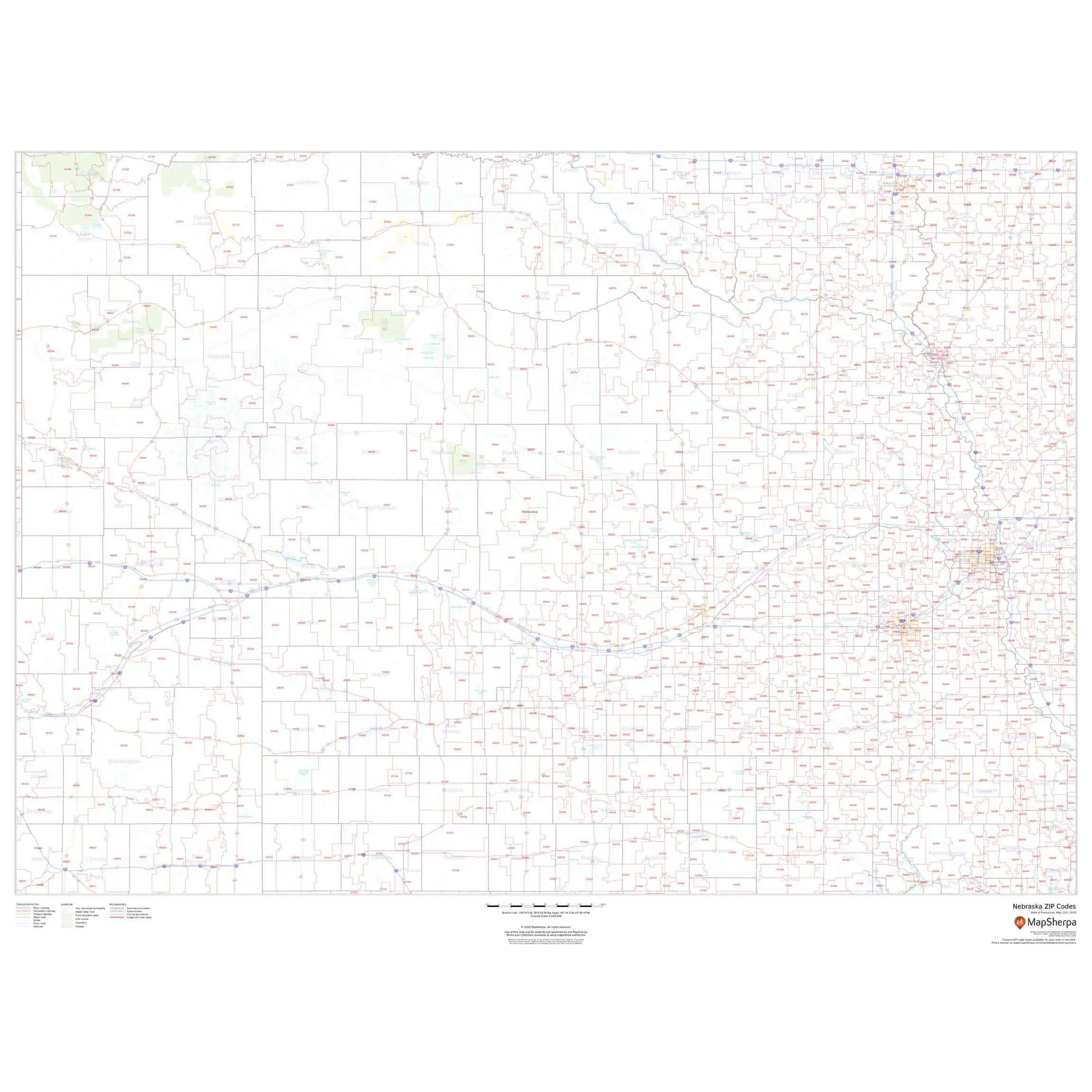 This map of Nebraska shows zip codes overlaid on a road map. Base map features include county boundaries, major road network features, and state and national parks and conservation areas.