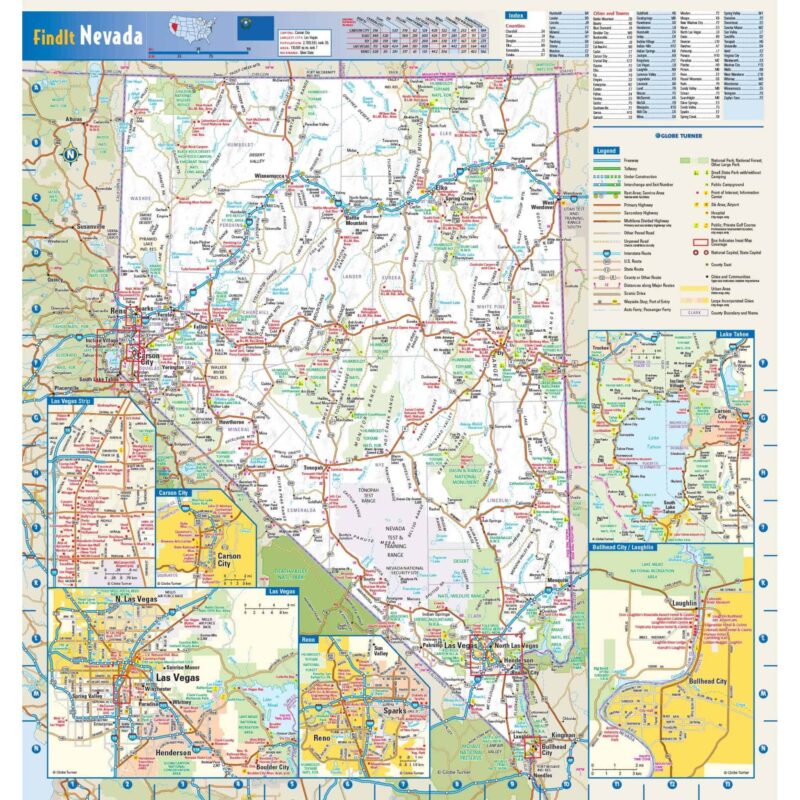 This colorful, easy-to-read state map of Nevada identifies all major thoroughfares, secondary roads, freeway interchanges, rest areas, distance markers, landmarks, recreational areas, and more. Shaded relief on the state map provides a three-dimensional sense of Nevada’s topography. Detailed city inset maps of Carson City, Laughlin, Las Vegas, and Reno are based on the latest street information from our cartographic experts. Additional insets of the Las Vegas Strip and Lake Tahoe depict must-see points of interest in these tourist areas. County and city indices make it simple to locate even the smallest town.