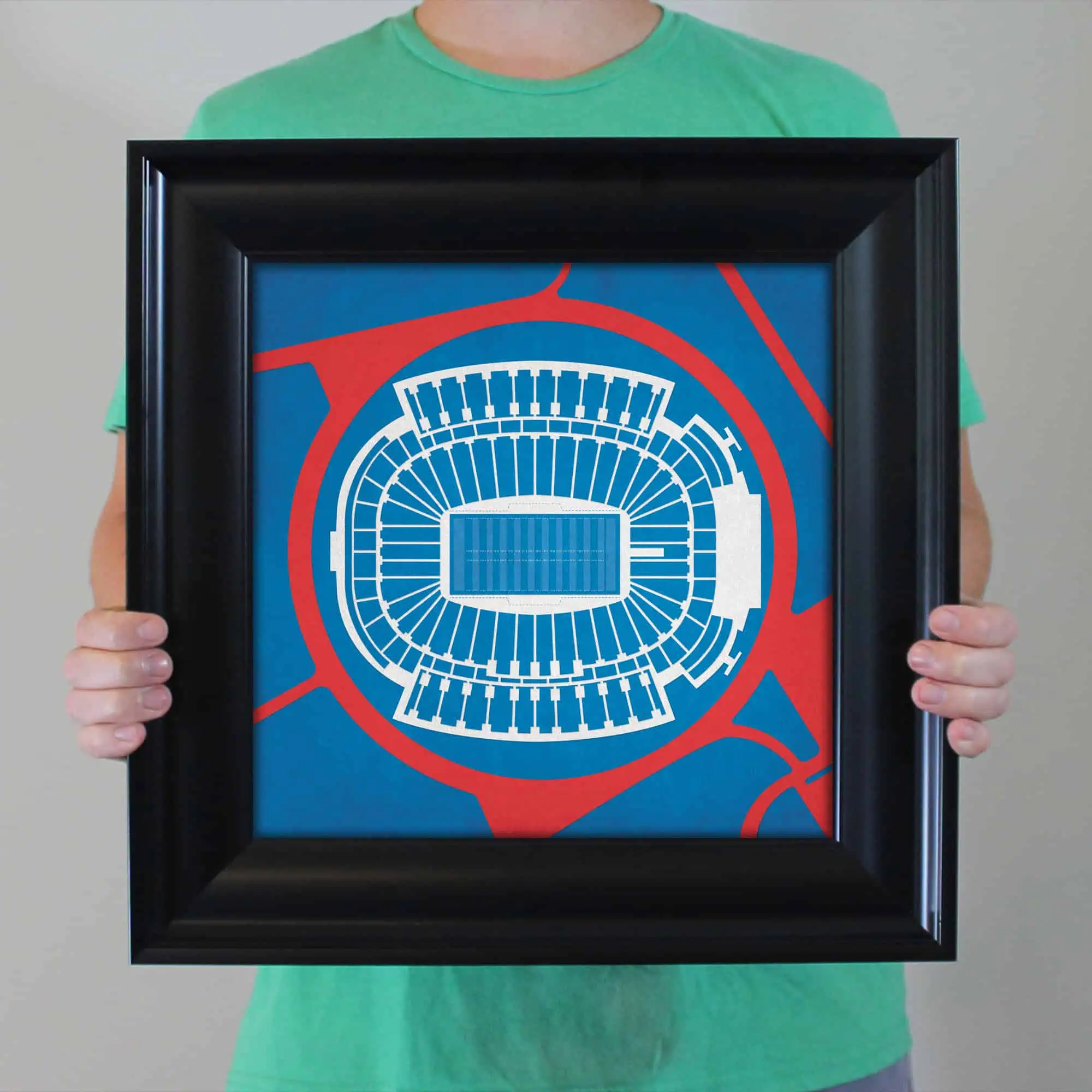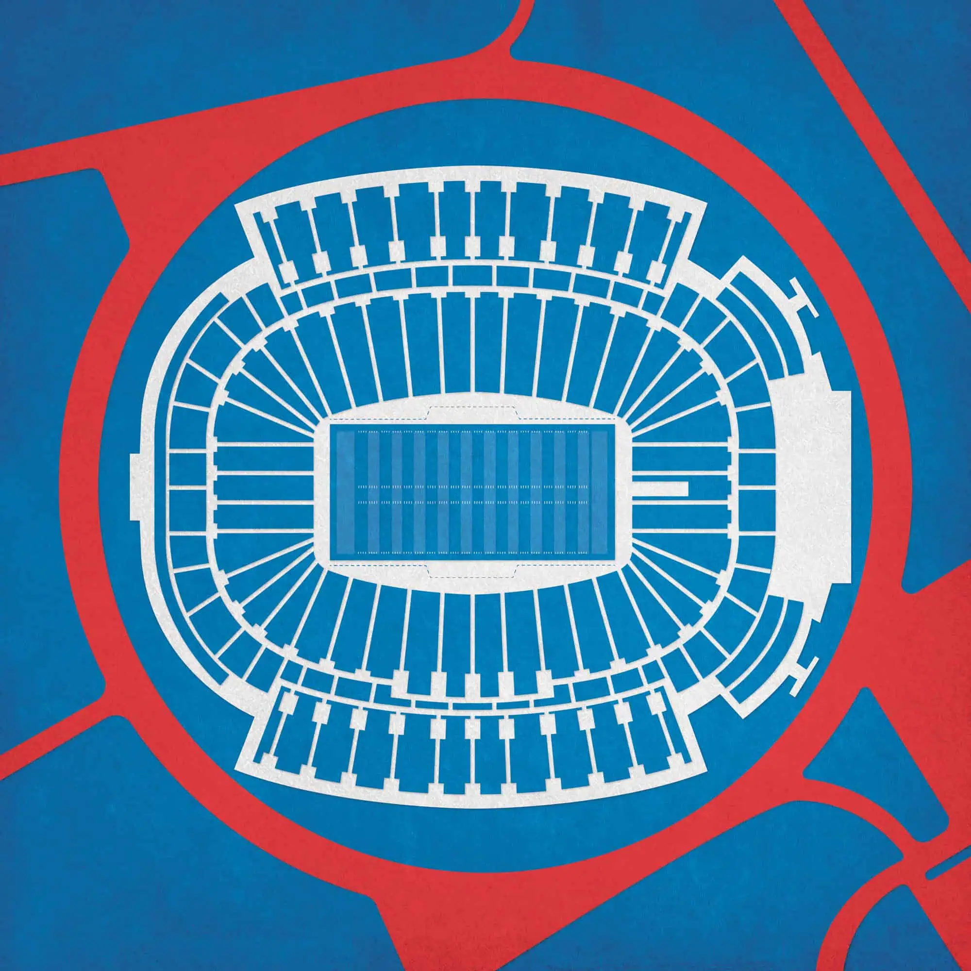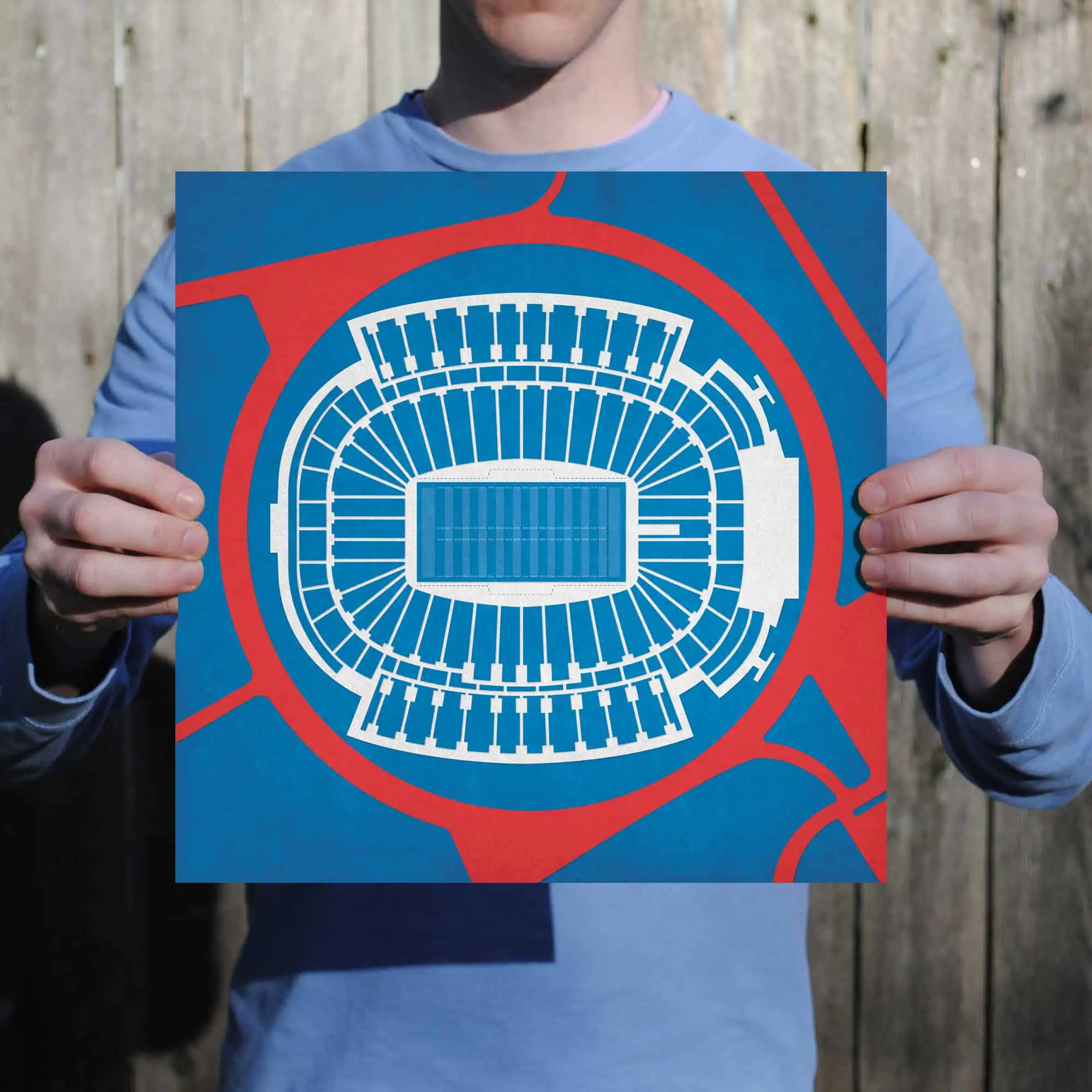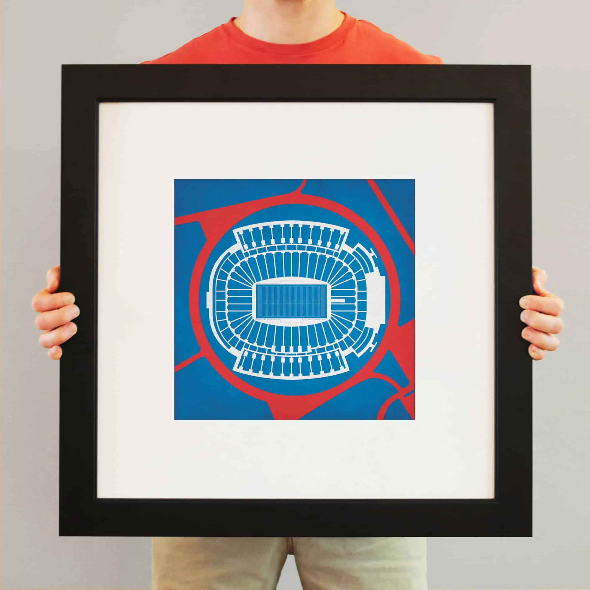 Map art print including the aerial view of New Era Field located in Orchard Park, New York.