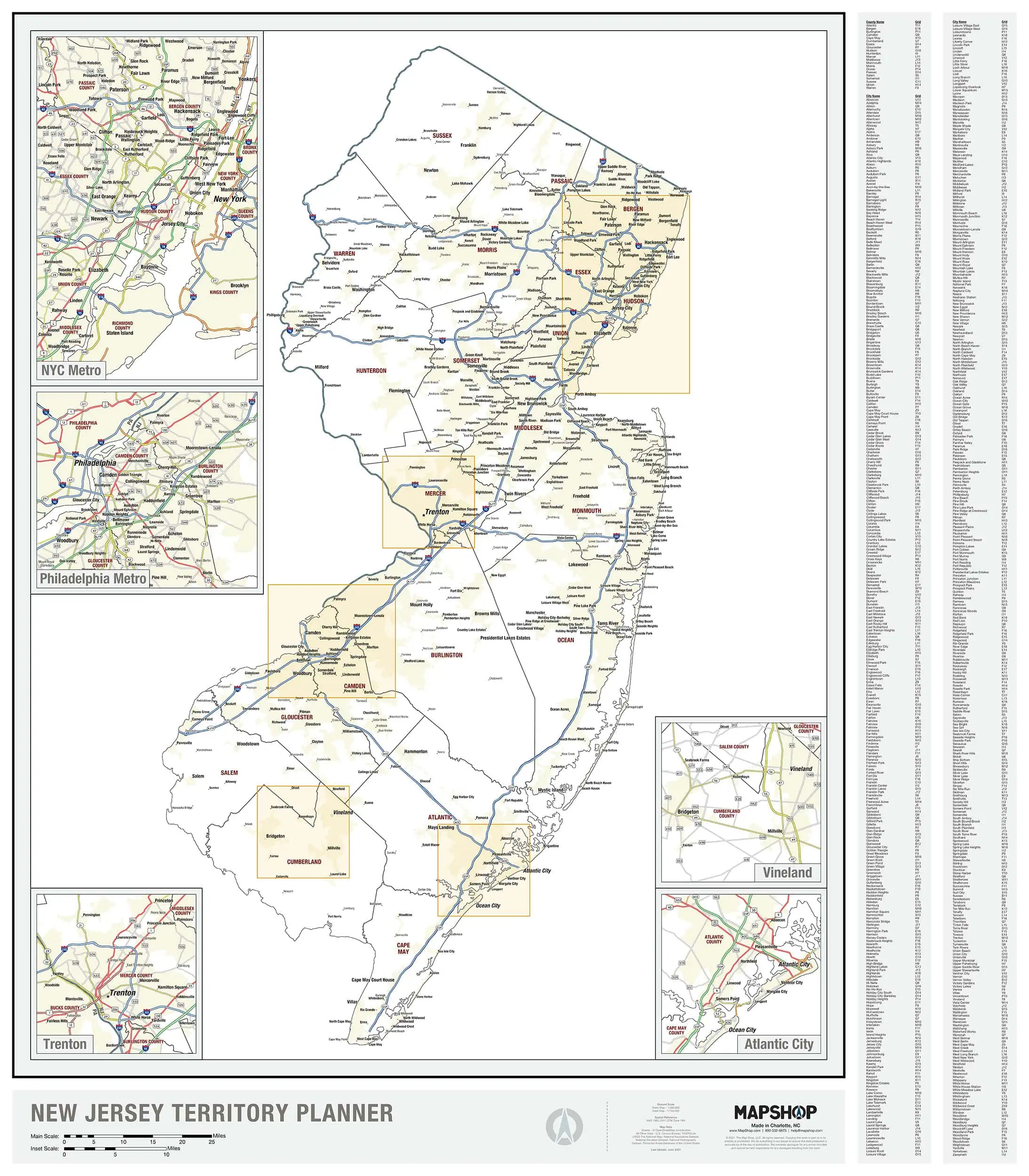 The Map Shop’s goal is simple. We want to inspire adventure, connect customers to past memories, and offer a better understanding of our country. We developed this New Jersey Planning Wall Map in-house so we’d have complete control over the cartography and design of the map. The result is a map that is as much fine art as it is a geographic reference. While simpler than the New Jersey Wall Map itself, this map is not lacking in any way: