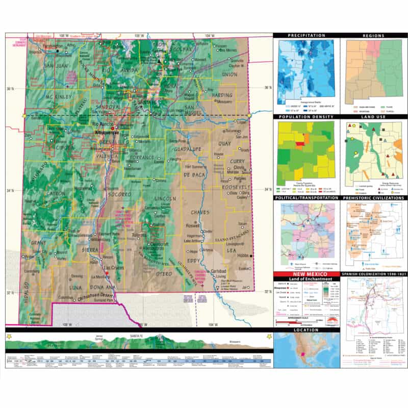 The New Mexico State Intermediate Thematic Wall Map is the perfect teaching aid for state studies and related subjects. Political/physical maps with hypsometric colorations; shows county boundaries, interstate highways, county seats, cities and towns and state regions. Maps correlate with state standards and curriculum guidelines. I