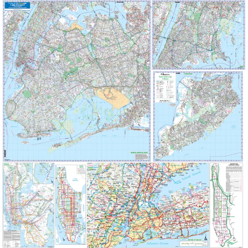 A street-level wall map covering all five NYC boroughs – Manhattan, Brooklyn, Queens, The Bronx, and Staten Island. Published by Hagstrom through Kappa Map Group, this is one of the most detailed large-format NYC maps available.