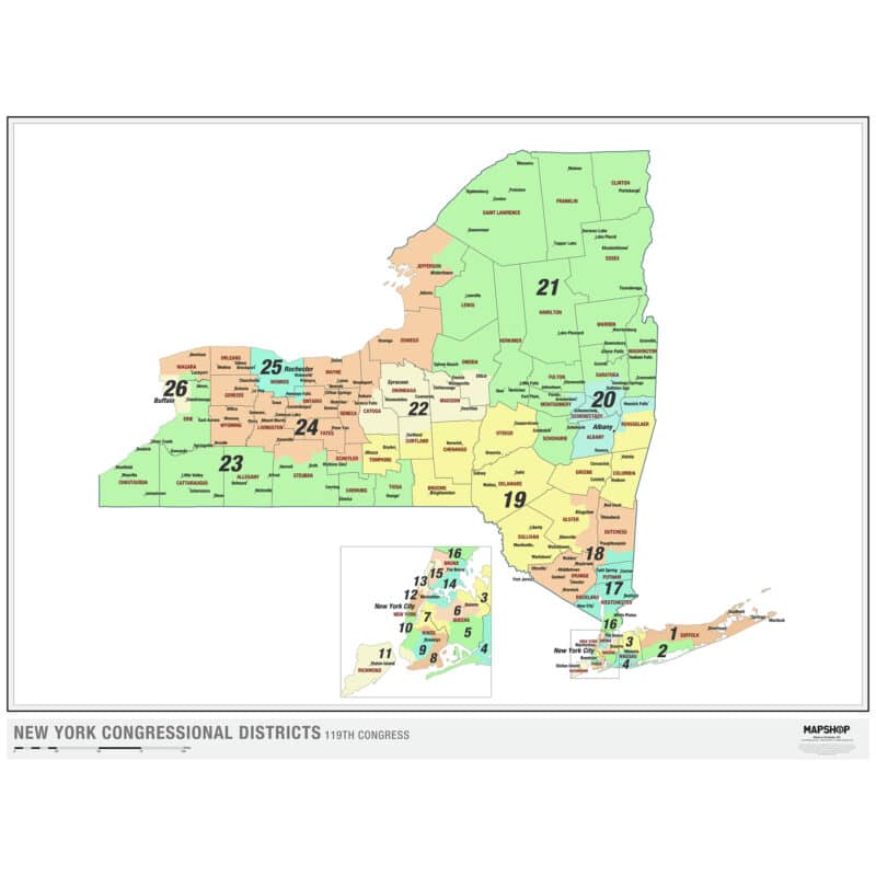 The Map Shop’s goal is simple. We want to inspire adventure, connect customers to past memories, and offer a better understanding of our country. We developed this New York Congressional Districts Wall Map in-house so we’d have complete control over the cartography and design of the map. The result is a map that is as much fine art as it is a geographic reference with the most up-to-date Congressional District boundaries on the market.