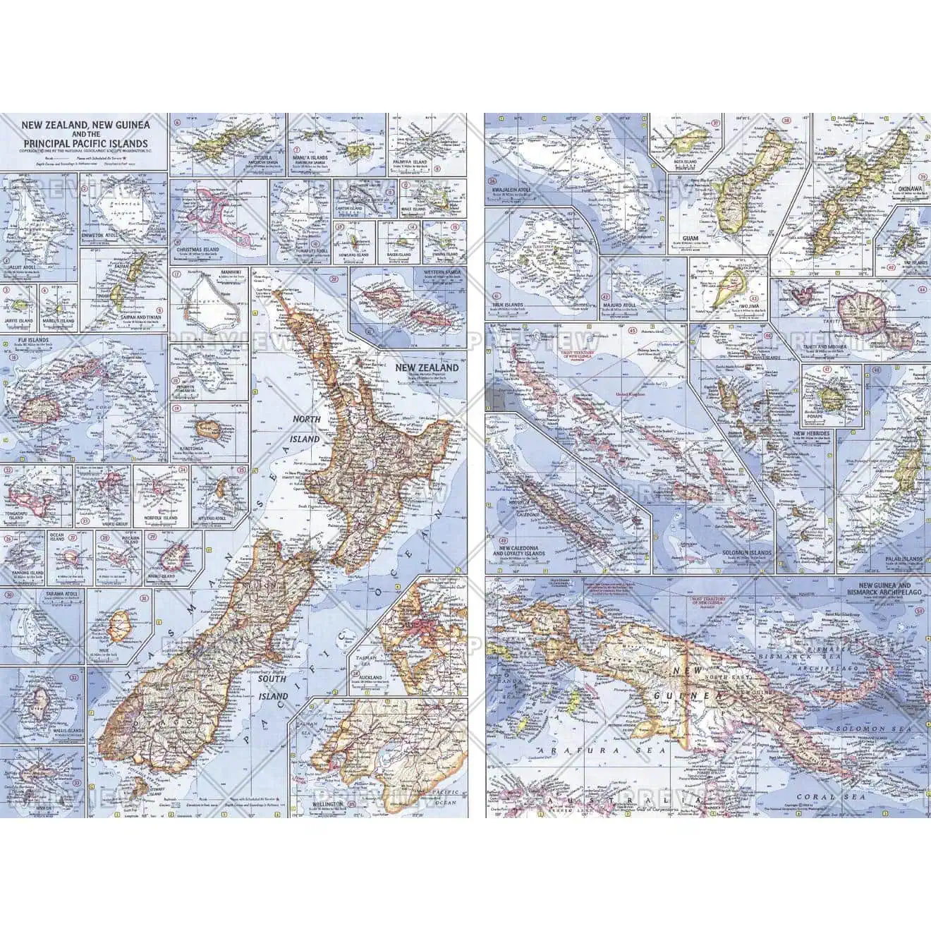 This map of the Pacific Ocean includes Australia, the Pacific Islands, and the continental coastlines that border the ocean. Inset maps provide detail of some of the larger islands groups. Published in April 1962, this map accompanied an article on New Zealand and the map of New Zealand, New Guinea and the Principal Pacific Islands.