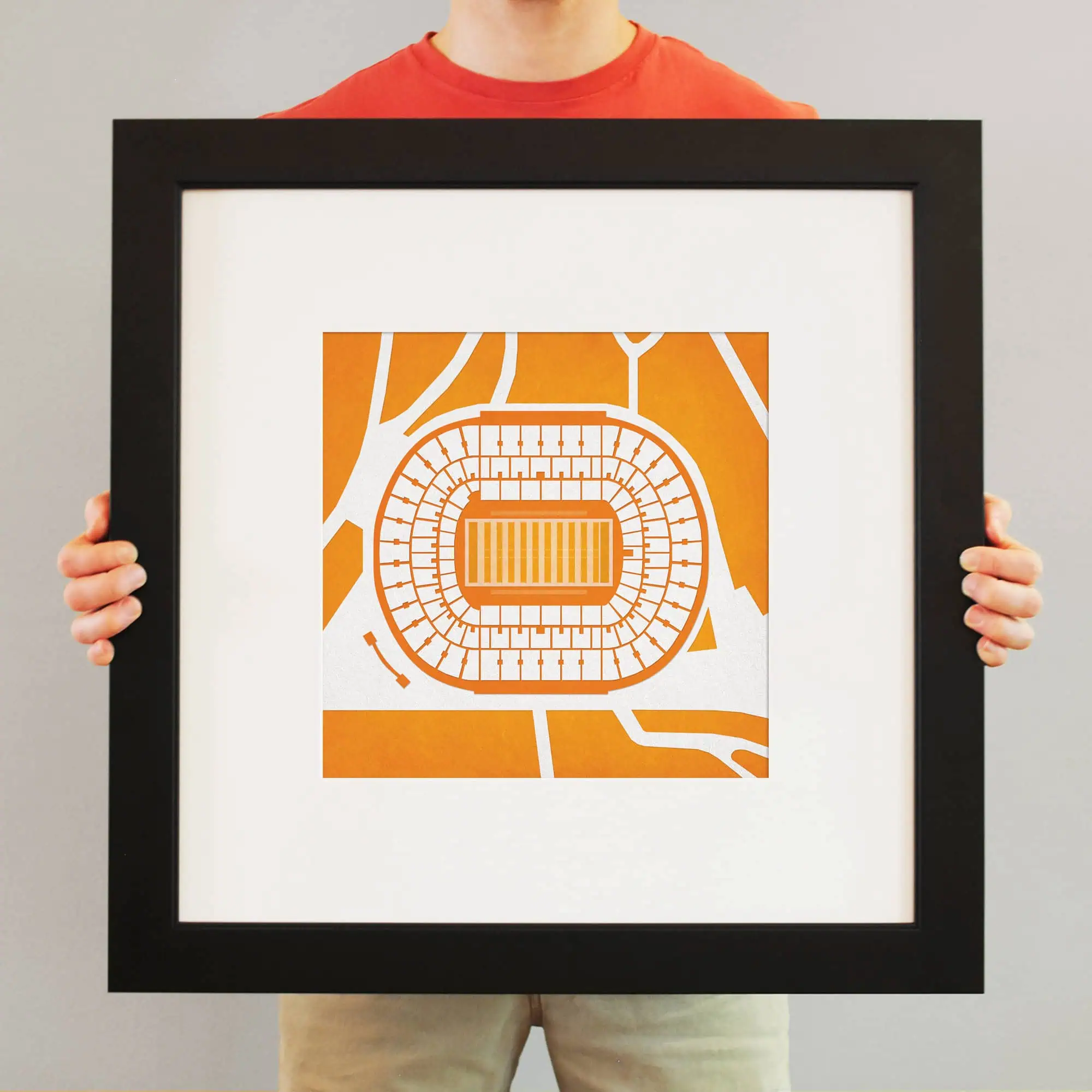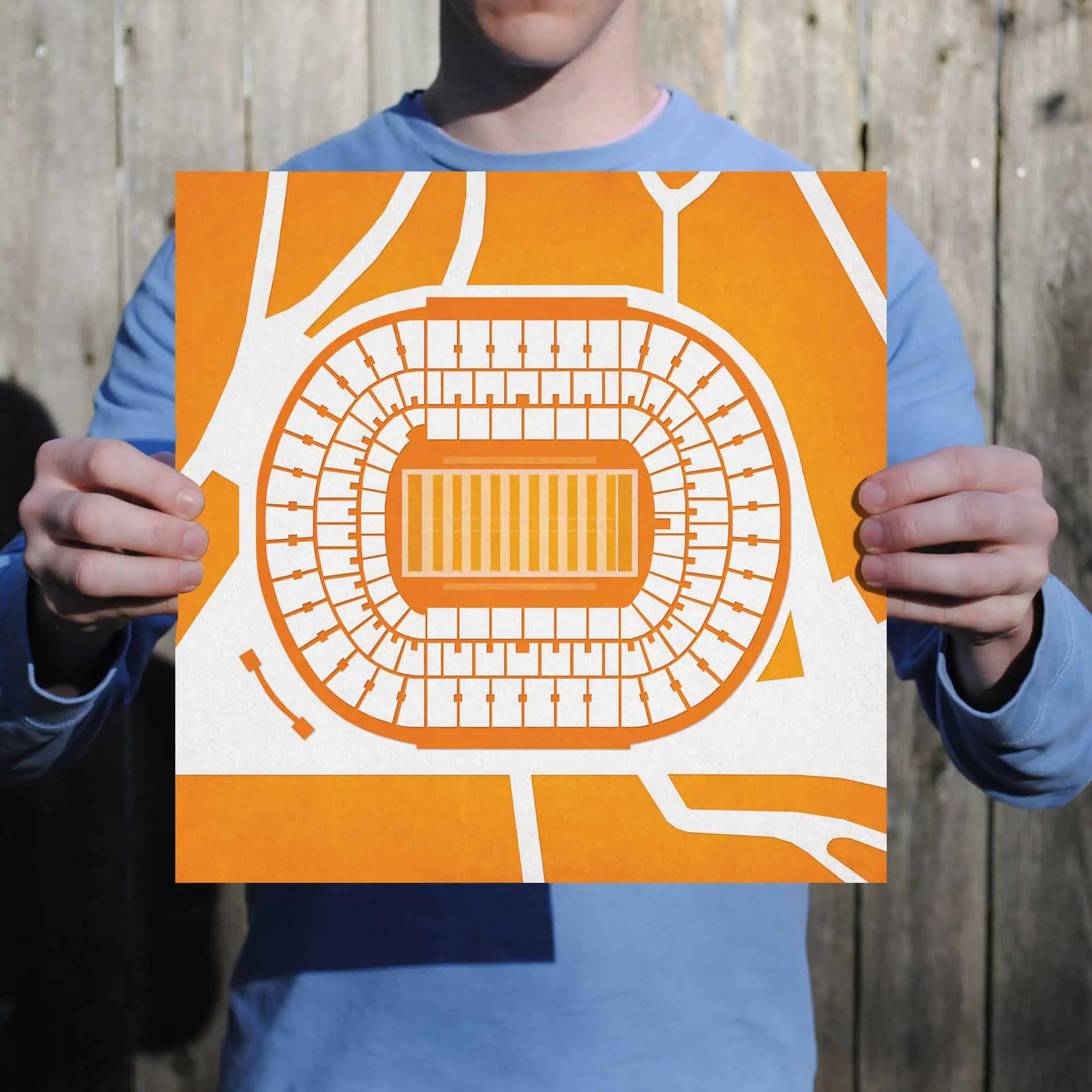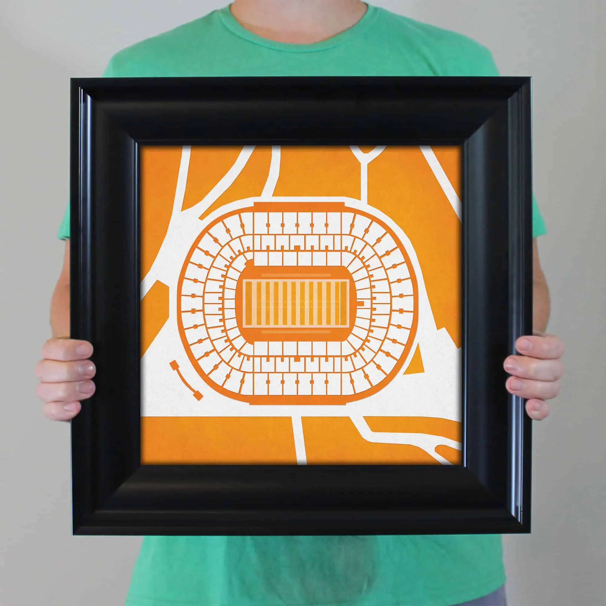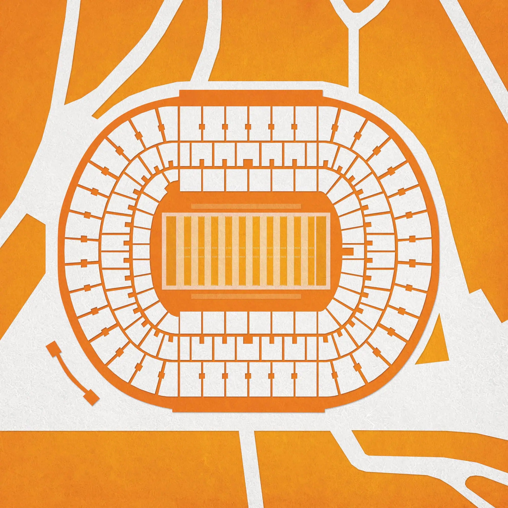 Map art print including the aerial view of Neyland Stadium located at the University of Tennessee in Knoxville, Tennessee.