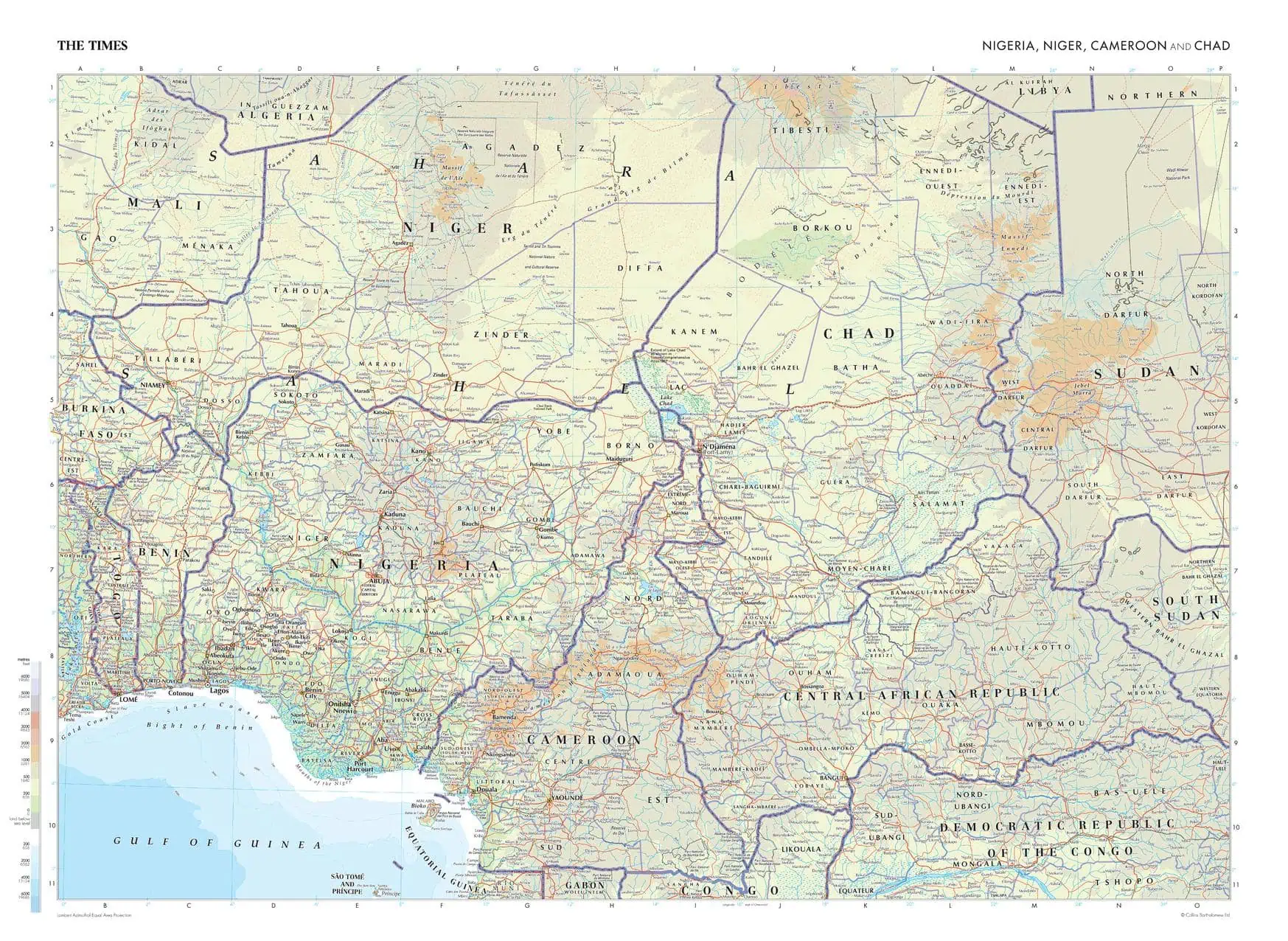This map of Nigeria, Niger, Cameroon, and Chad stands as a benchmark of cartographic excellence, sourced from the industry-leading Times Comprehensive Atlas of the World. Published in full colour, this map offers a comprehensive and updated view of the landscapes that are found in this region. Prominent features such as the bustling cities of Lagos, Niamey, and N'Djamena are clearly identifiable, as are geographical features such as the Sahara Desert and Lake Chad. Additional mapping covers countries such as the Central African Republic, Mali, Benin, and Tongo. With meticulous attention to detail, this map is an indispensable guide to the geographic intricacies of Nigeria, Niger, Cameroon, and Chad.