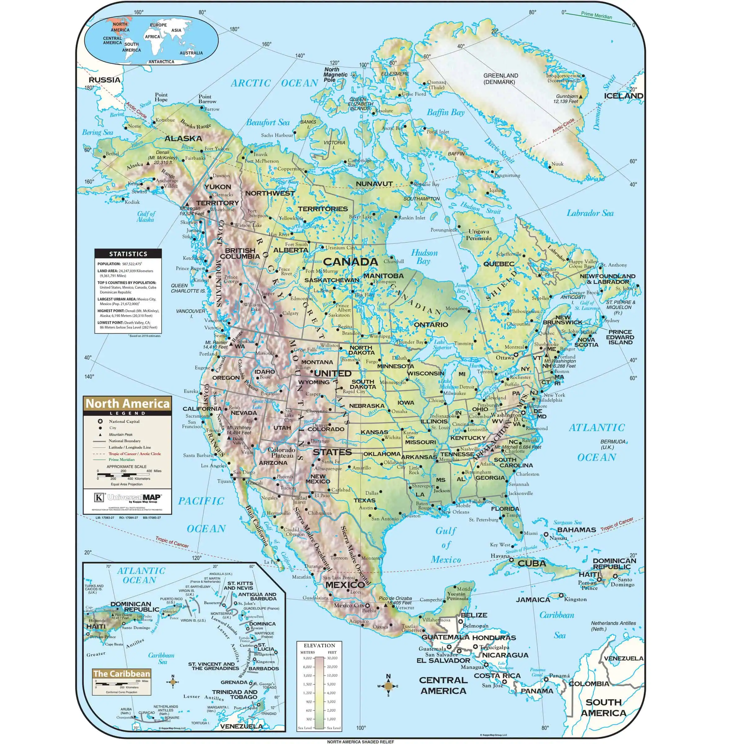 The Shaded Relief series by Kappa Map Group showcases varying elevations using color gradation to indicate different altitudes, with lighter colors representing higher elevations. The map is comprehensive and includes a multitude of geographical and political details.