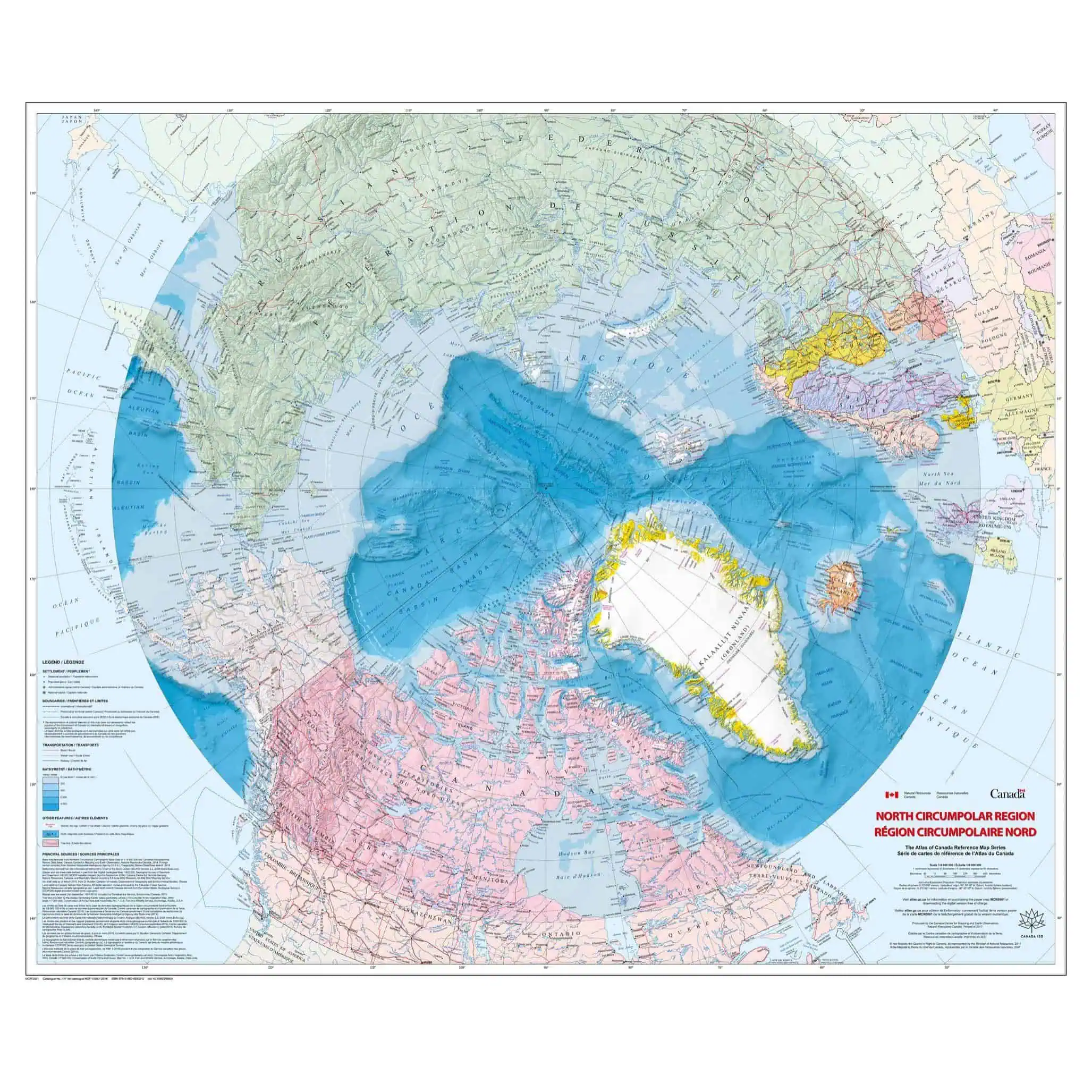 This bilingual map shows the geography of the northern circumpolar region, north of approximately 55 degrees, at a scale of 1:9 000 000. The map uses the azimuthal equidistant projection. It includes all international boundaries, as well as the Canadian provincial and territorial boundaries and Canada’s 200 nautical mile offshore exclusive economic zone. National capital cities are shown, as are other cities, towns, villages and hamlets. Some seasonally populated places are also included. The map displays a number of significant northern features, including the median sea ice extent for September 1981 to 2010, the tree line, undersea relief, land relief, the Magnetic North Pole, glaciers, ice fields and coastal ice shelves. Many of the physiographic and hydrographic features are labeled.Â