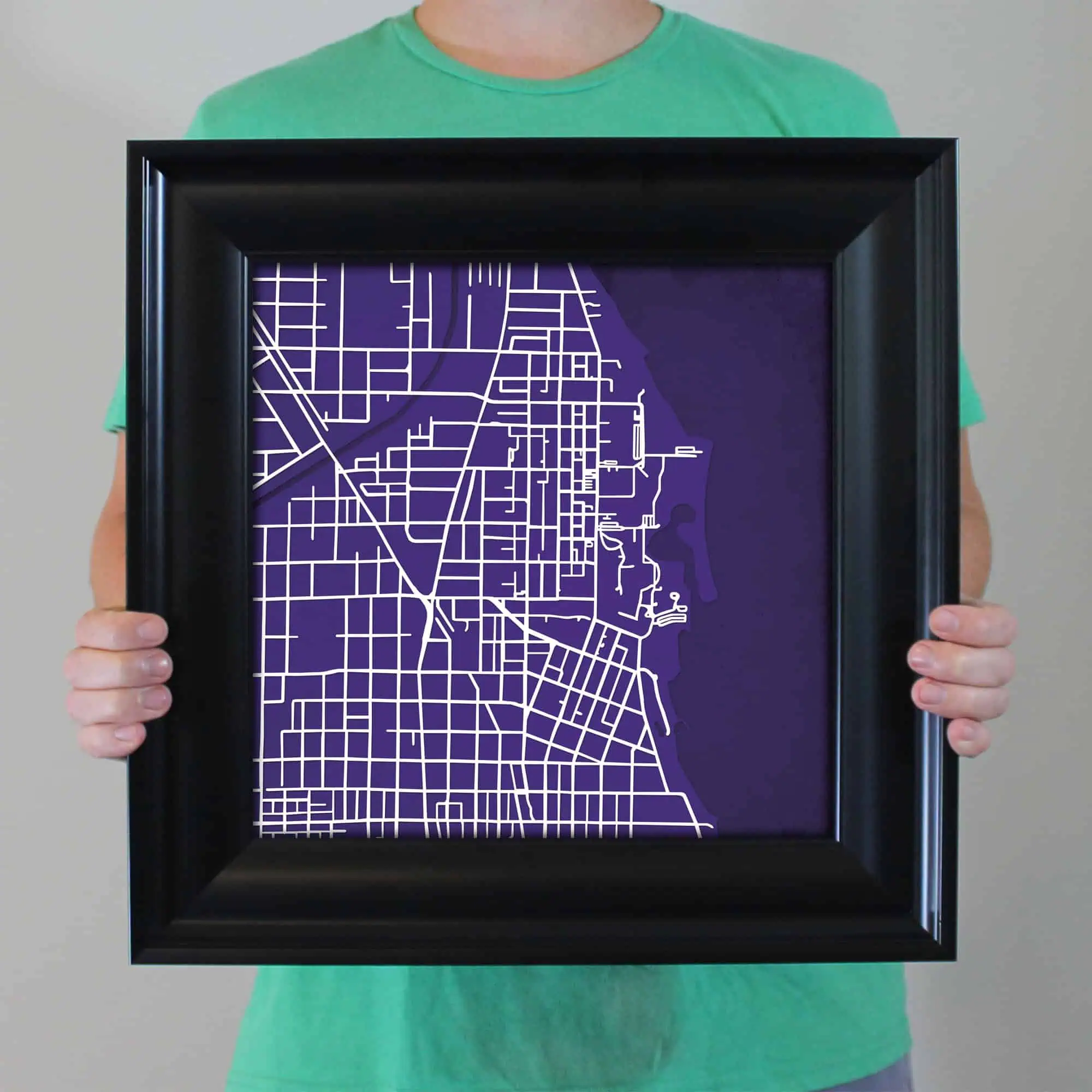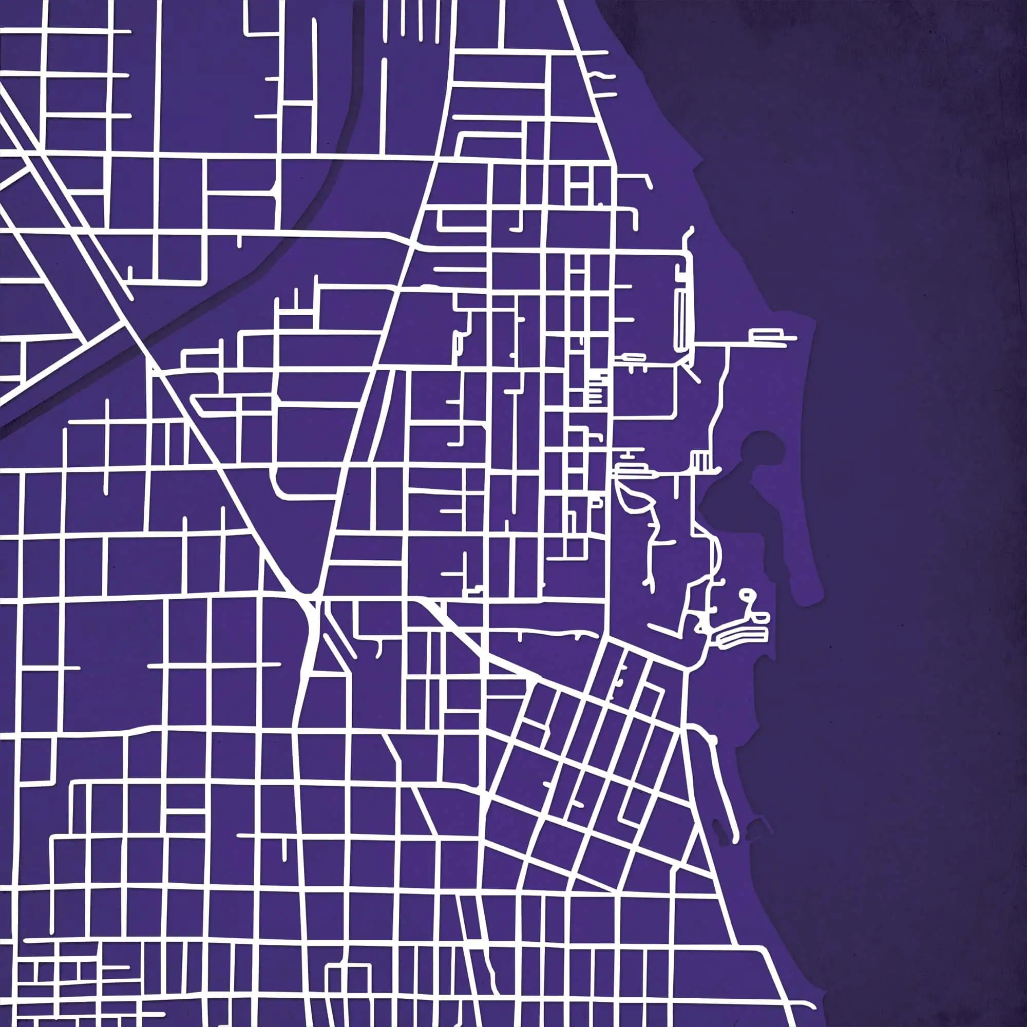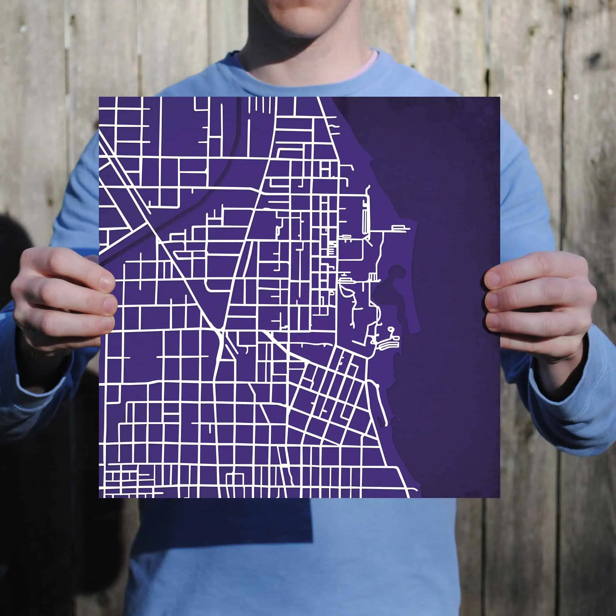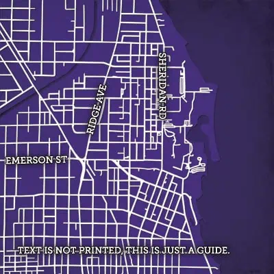 Map art print including Northwestern University campus located in Evanston, Illinois.