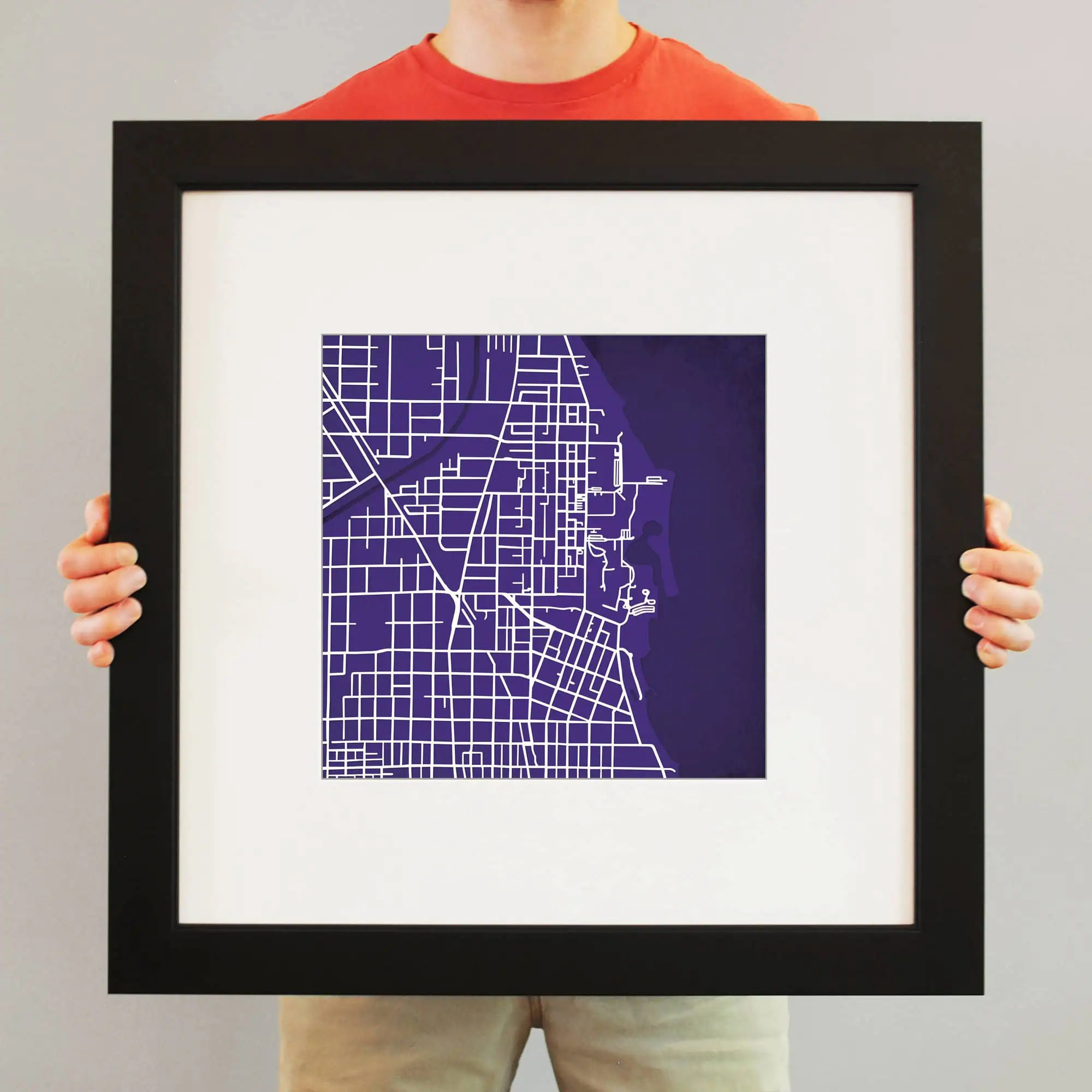 Colorful city map wall art featuring prominent street layouts and urban design, perfect for home or office decor, highlighting city navigation and geographic features.