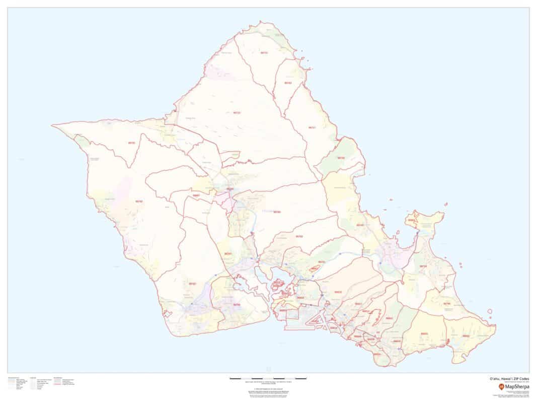 This map of O'ahu, Hawai'i shows ZIP code areas overlaid on a road map. Ideal for planning of deliveries, home services, sales territories, real estate and much more. Base map features include all roads with major roads and highways labelled; neighborhood names; railways; and high level land use such as parks and recreation areas, industrial areas and hospital campuses.