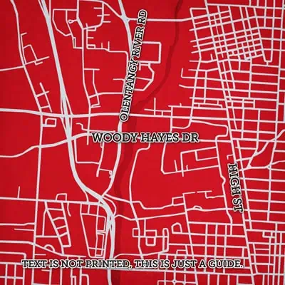 Map art print including Ohio State University campus located in Columbus, Ohio.