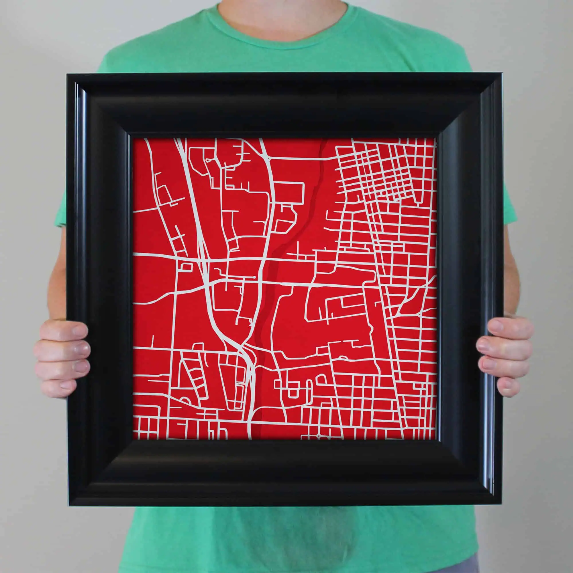 The size of this frame will vary depending on the size of the map you created. Frames are 16.5″ x 16.5″ for 12″ x 12″ prints and frames are 16.5″ x 20.5″ for 12″ x 16″ maps. Our frames have a black 2.75” wide heavy polystyrene molding. We choose to mount the prints without a glass/acrylic overlay, which shows off the unique properties of our paper stock when it hits the light. The back of the frame is sealed with a dust cover for added protection. Industrial silver hanging hardware is fixed to the back of the frame so it’s ready to hang on your wall.