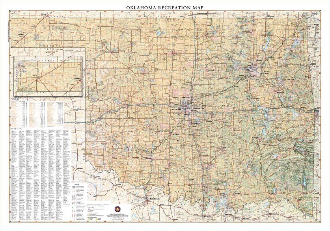 Oklahoma lies where the sweeping prairies of the Great Plains meet the western shoulder of the Ozark Mountains. This wall map illustrates The Sooner State’s array of country roads and recreation opportunities.