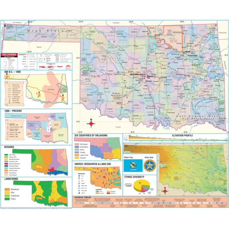 The Oklahoma Shaded Relief Wall Map by Kappa Map Group comes in three sizes. It includes: