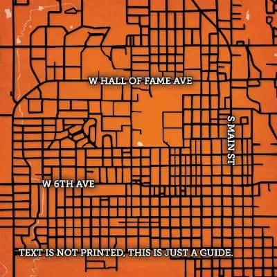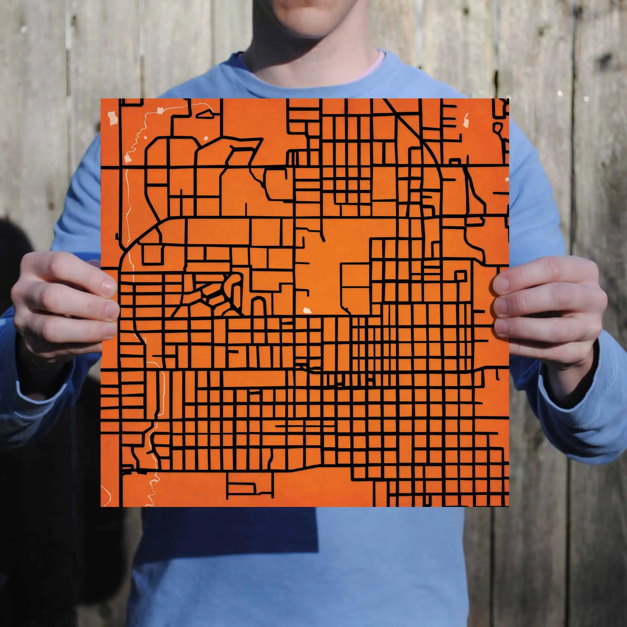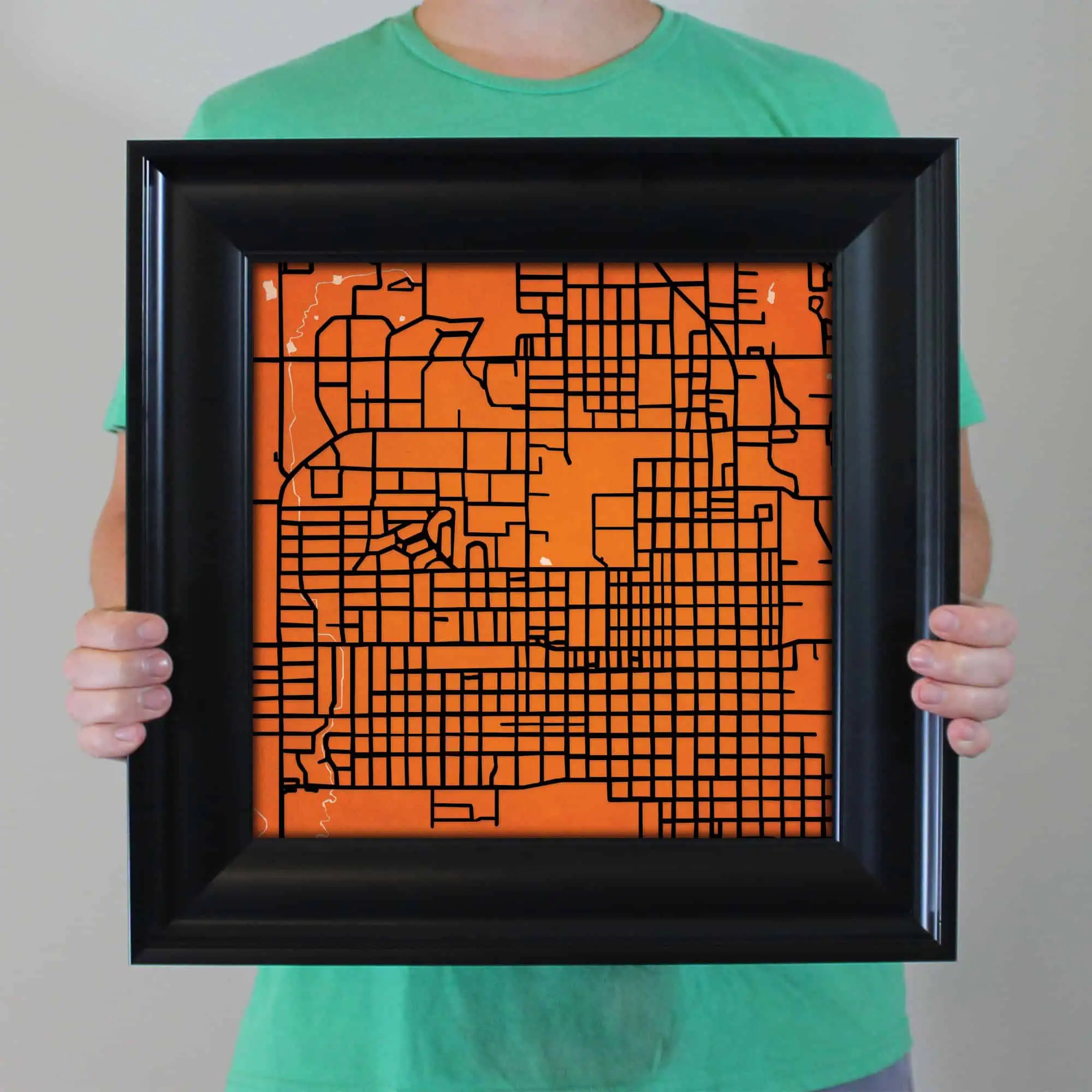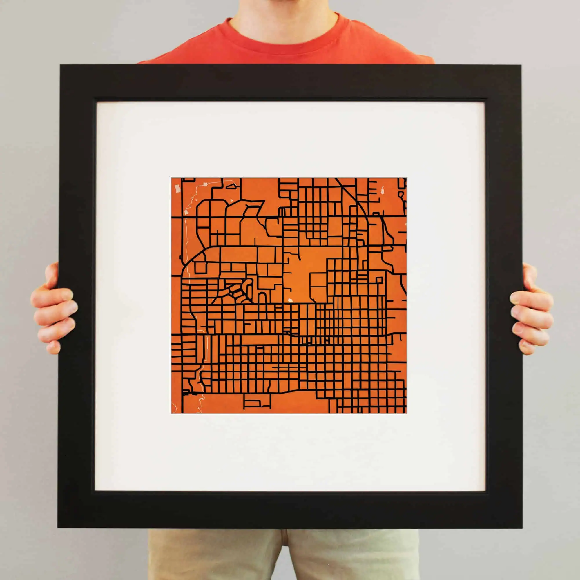 Map art print including Oklahoma State University campus located in Stillwater, Oklahoma.