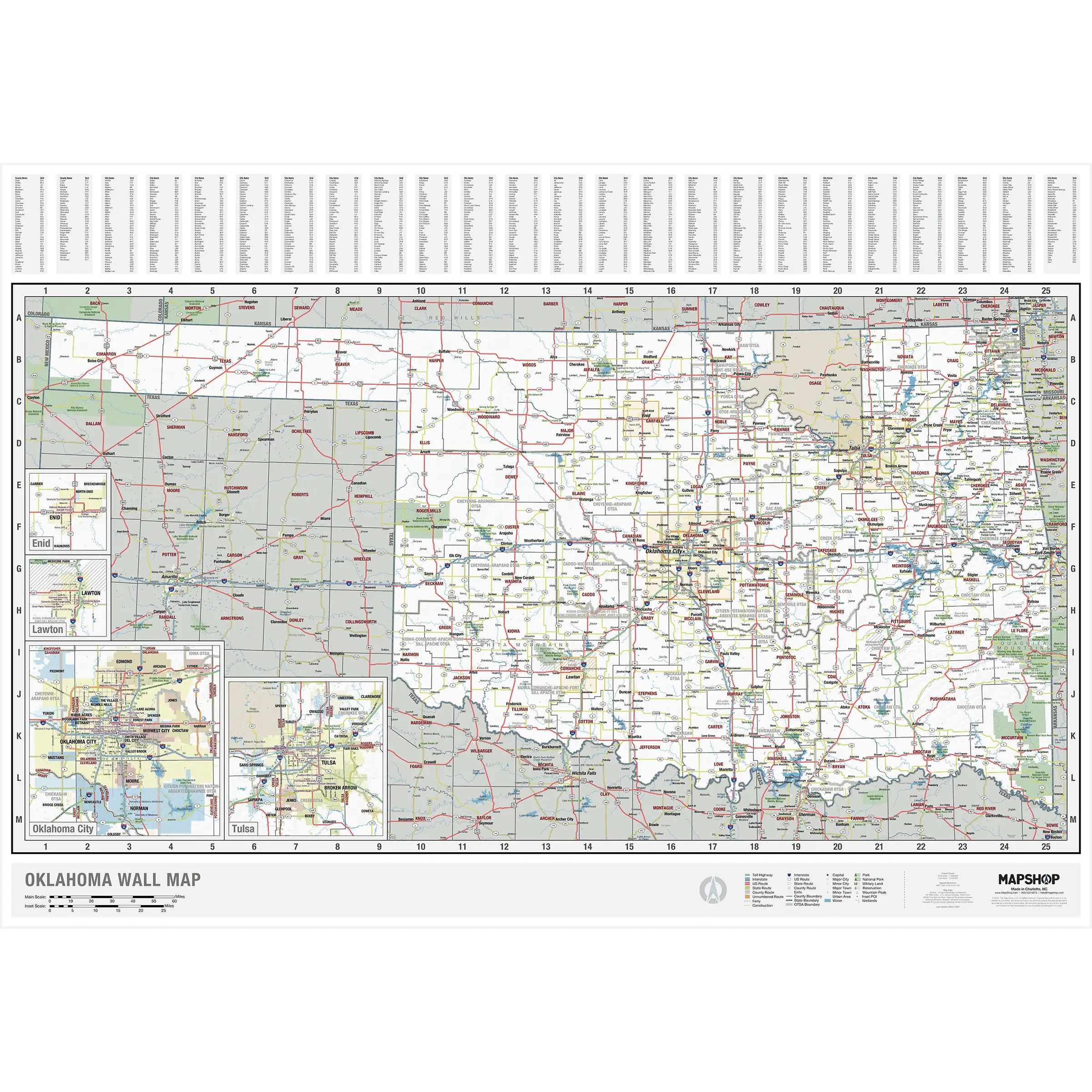 The Map Shop’s goal is simple. We want to inspire adventure, connect customers to past memories, and offer a better understanding of our country. We developed this Oklahoma State Wall Map in-house so we’d have complete control over the cartography and design of the map. The result is a map that is as much fine art as it is a geographic reference. We even have three (3) convenient sizes you can choose the map that best fits your space. With one of the most all-inclusive Oklahoma State maps on the market, you can’t go wrong with our wall map for any use: