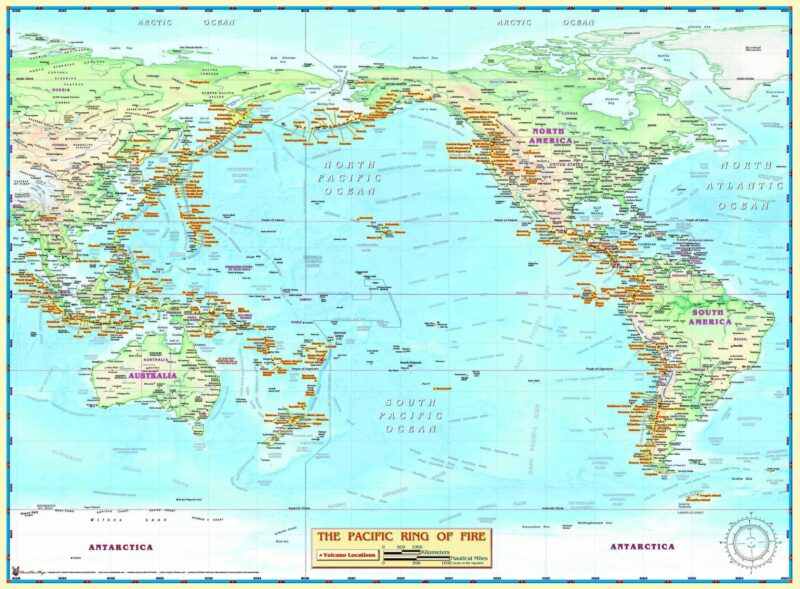 Introducing Compart Maps Pacific Ring of Fire Wall Map. Beautifully illustrated with subtle earth tone hues, the detail is highly legible with country borders clearly defined. In classic Atlas style, this map can be used for general reference, to track current events, or as a piece of art. Decorators will find the color scheme works beautifully with most furniture and trim.