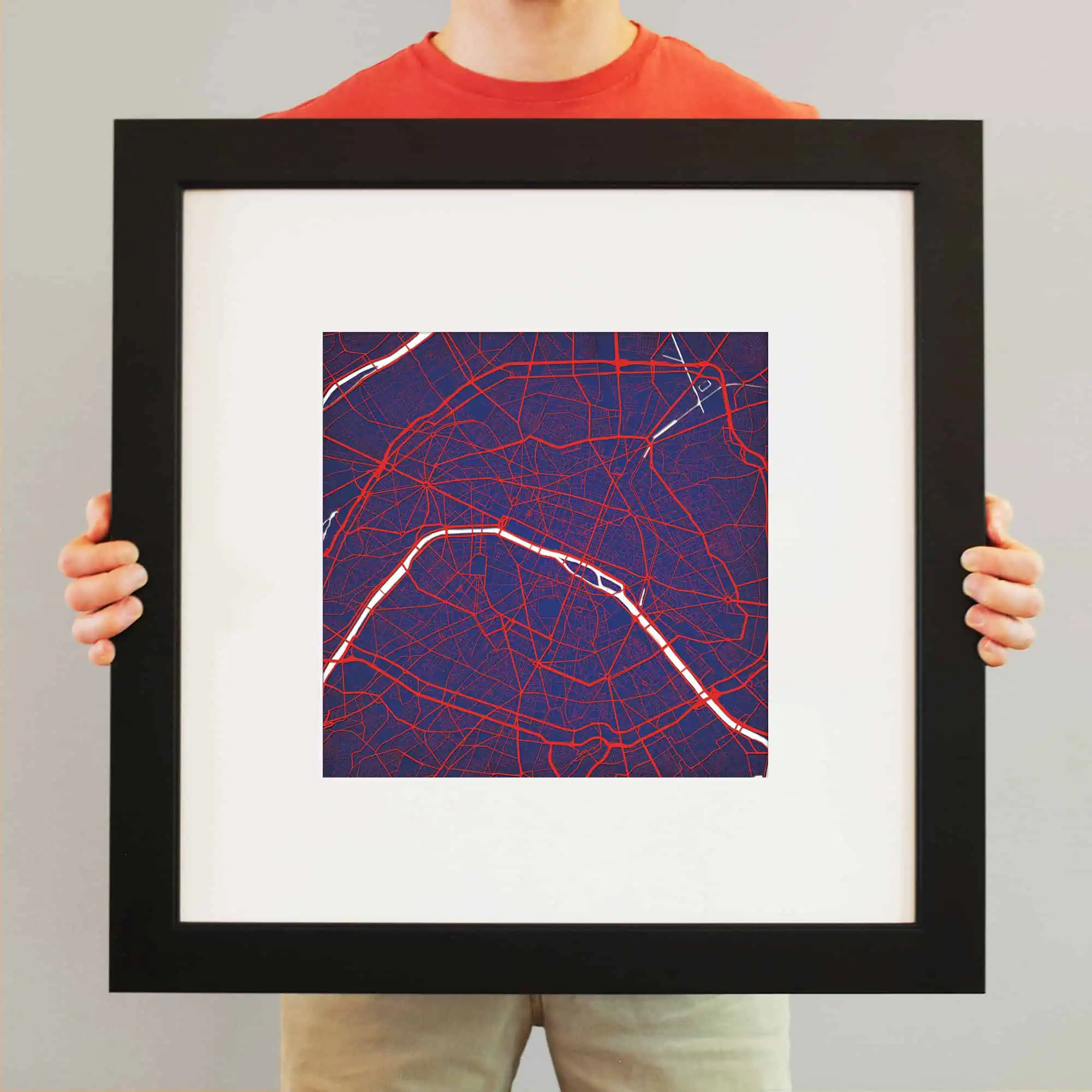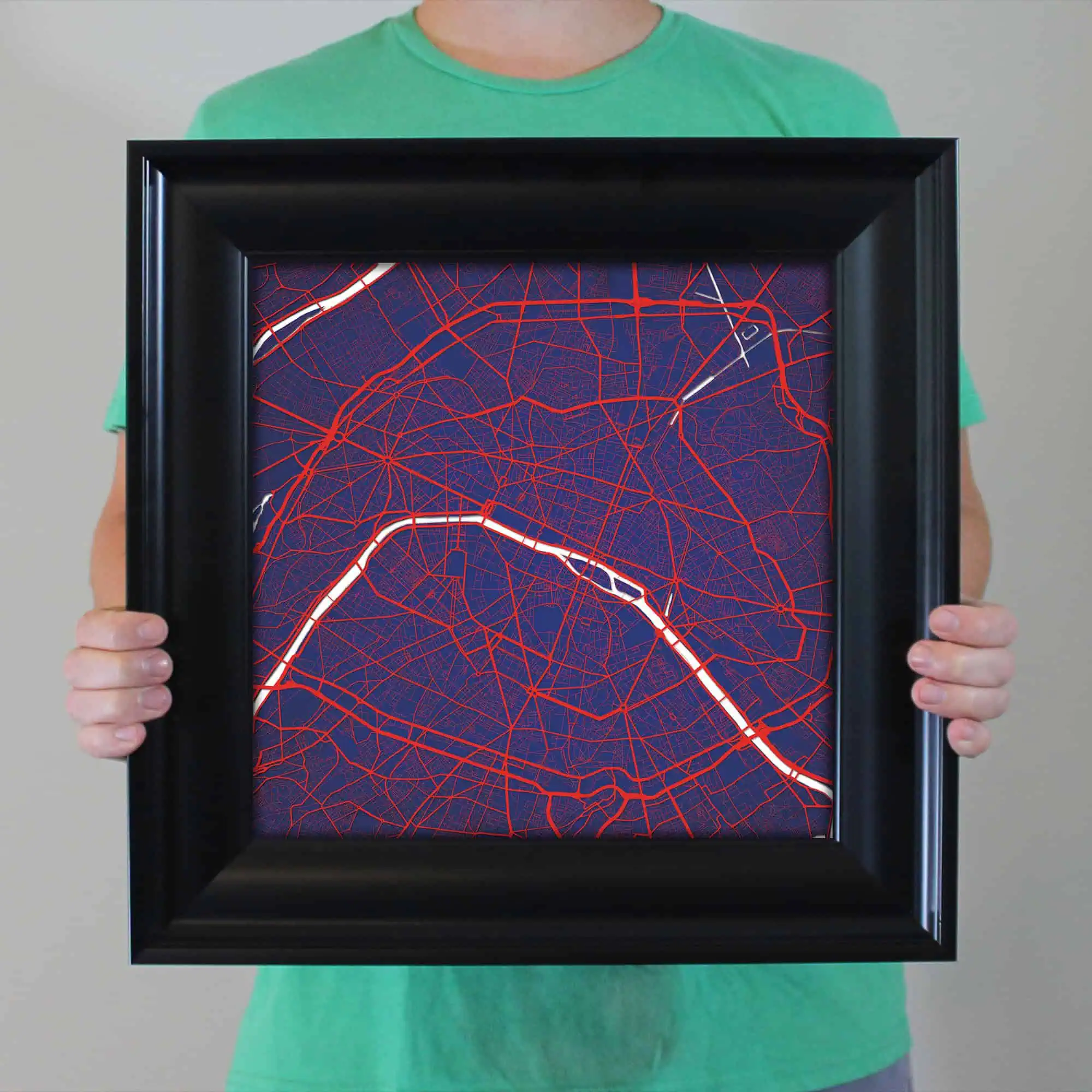 Colorful city map wall art featuring prominent street layouts and urban design, perfect for home or office decor, highlighting city navigation and geographic features.