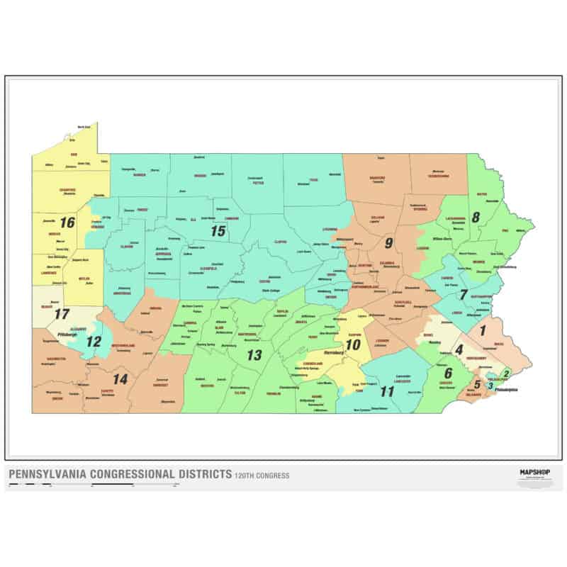 The Map Shop’s goal is simple. We want to inspire adventure, connect customers to past memories, and offer a better understanding of our country. We developed this Pennsylvania Congressional Districts Wall Map in-house so we’d have complete control over the cartography and design of the map. The result is a map that is as much fine art as it is a geographic reference with the most up-to-date Congressional District boundaries on the market.