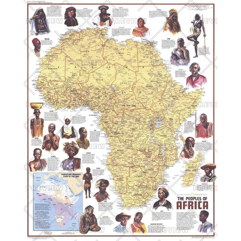 This map features Africa’s ethnic groups, identified by name and language. Includes beautiful illustrations and interesting facts about the diverse peoples that inhabit the continent. Published in December 1971 as half of a two–map set with the “Heritage of Africa” map, and as a companion to the article “The Zulus: Black Nation in a Land of Aparteid.”
