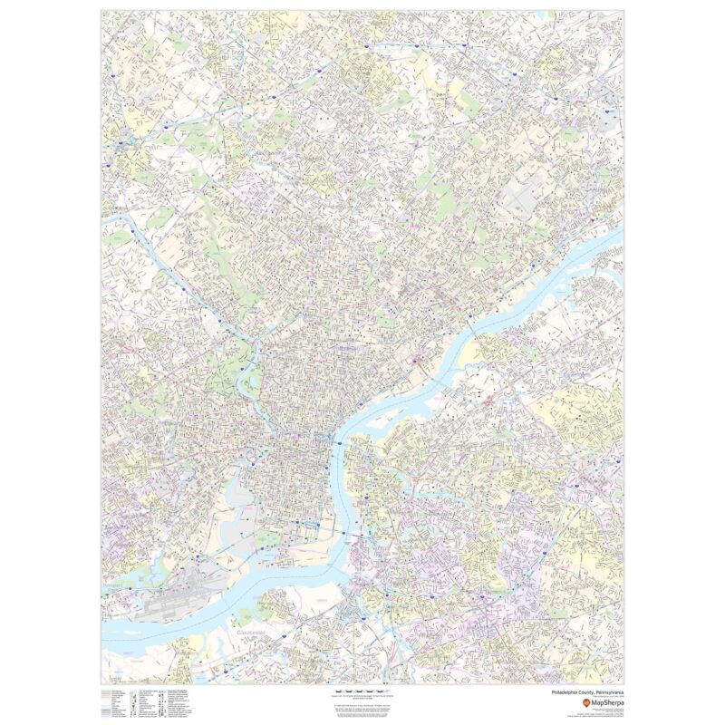 This map of Philadelphia County, Pennsylvania shows street level information including street labeling. Base map features include all roads with major roads and highways labelled; neighborhood names; railways; high level land use such as parks and recreation areas, industrial areas and hospital campuses; and a variety of points of interest including libraries, stadiums, museums, border crossings and more. zip code boundaries are shown as a secondary map feature.