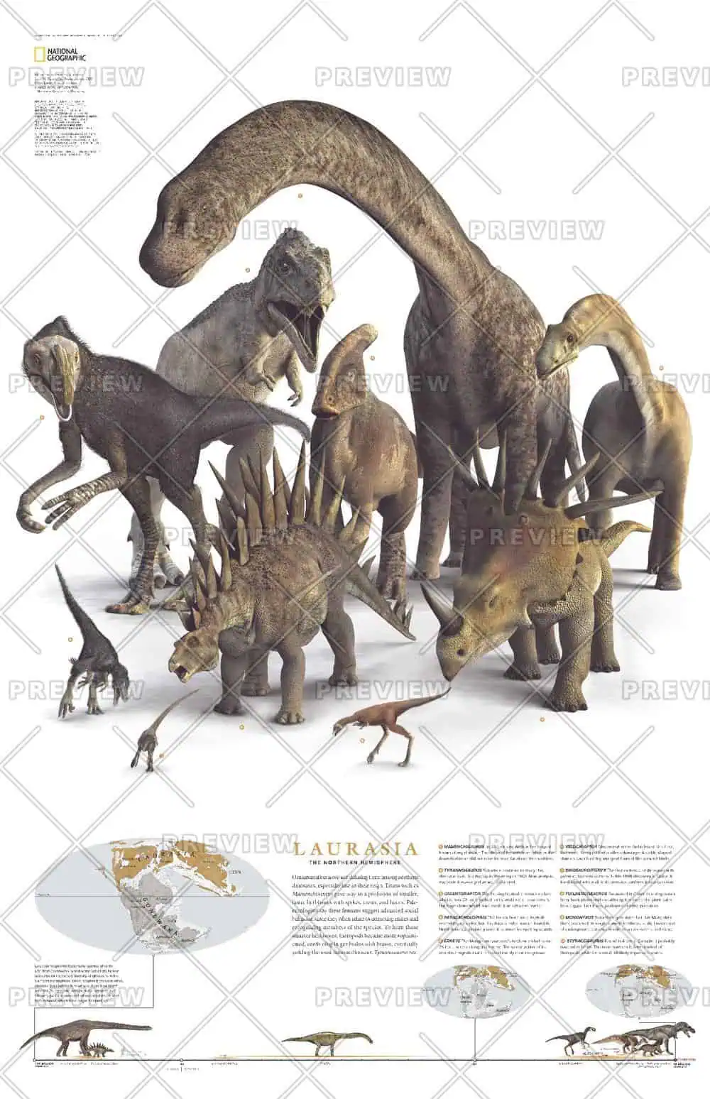 When the supercontient Pangaea separated into two great landmasses, Gondwana in the south and Laurasia in the north, dinosaur populations were divided into two main populations that evolved mostly in isolation from each other until they met their end 65 million years ago. This remarkable poster was published in December 2007 as half of a two-piece set. It features ten of the dinosaurs that roamed Laurasia in the northern hemisphere. More than 550 species of dinosaurs have been named, and scientists estimate that more than a thousand others are waiting to be found.