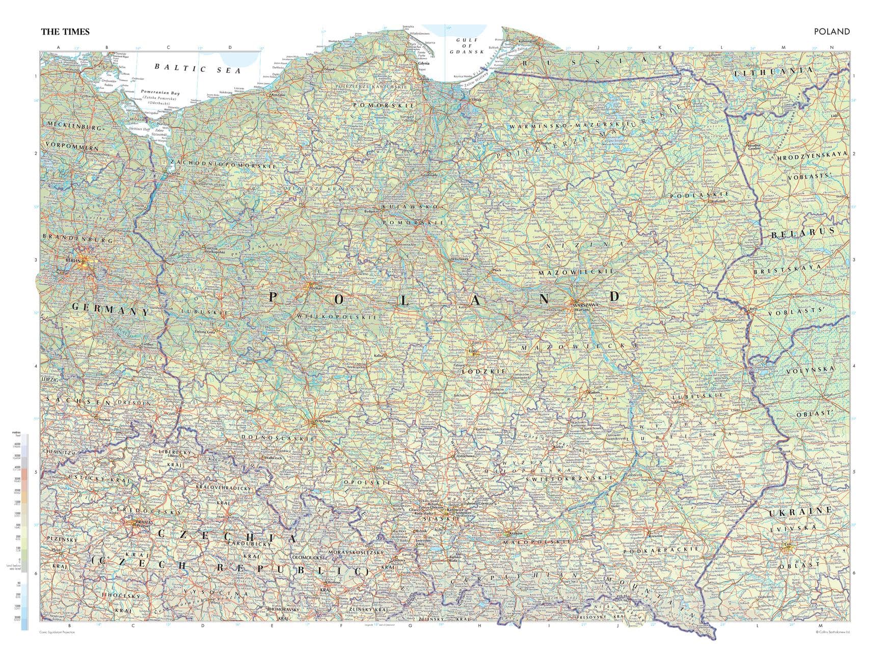 This map of Poland is a benchmark of cartographic excellence, taken from the industry leading Times Comprehensive Atlas of the World. There is a high level of detail packed into the map, yet the positioning of every element is carefully chosen to make the map coherent and attractive. Major cities including Krakow, Wroclaw and Lodz are clearly identifiable, as is the capital, Warszawa (Warsaw). International borders are easily seen, as are regional boundaries within Poland. Supplementary mapping covers eastern Ukraine, Belarus and Lithuania, west Germany and the north of the Czech Republic.