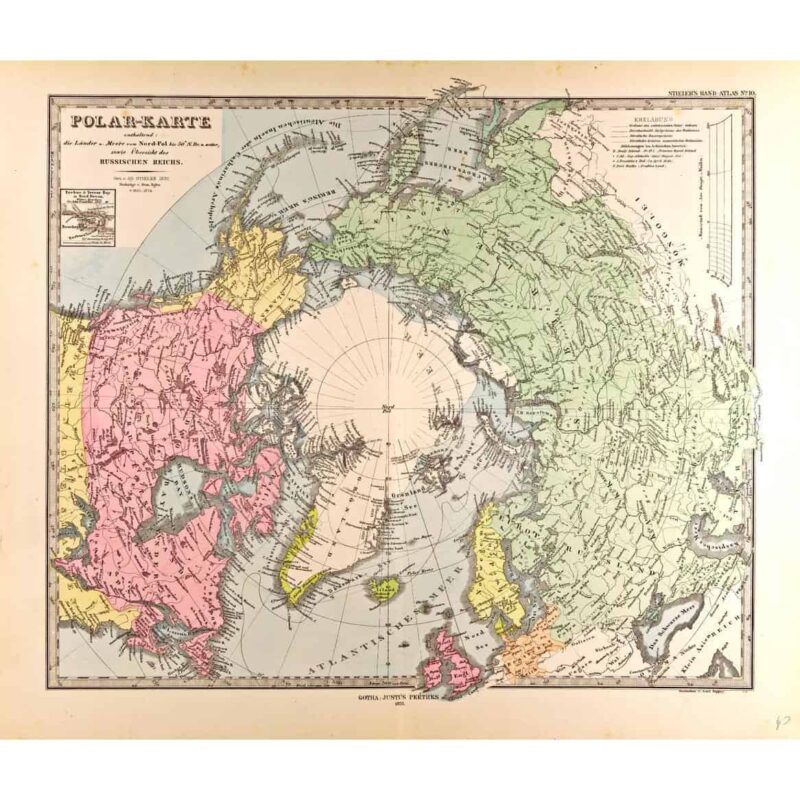Map of centered on the North Pole in German from the Gotha Justus Perthes 1872 Atlas. Full title: Polar-Karte enthalend: die Länder u. Meere vom Nord-Pol bis 50° N. Br. u. weiter; sowie Übersicht des Russischen Reichs.