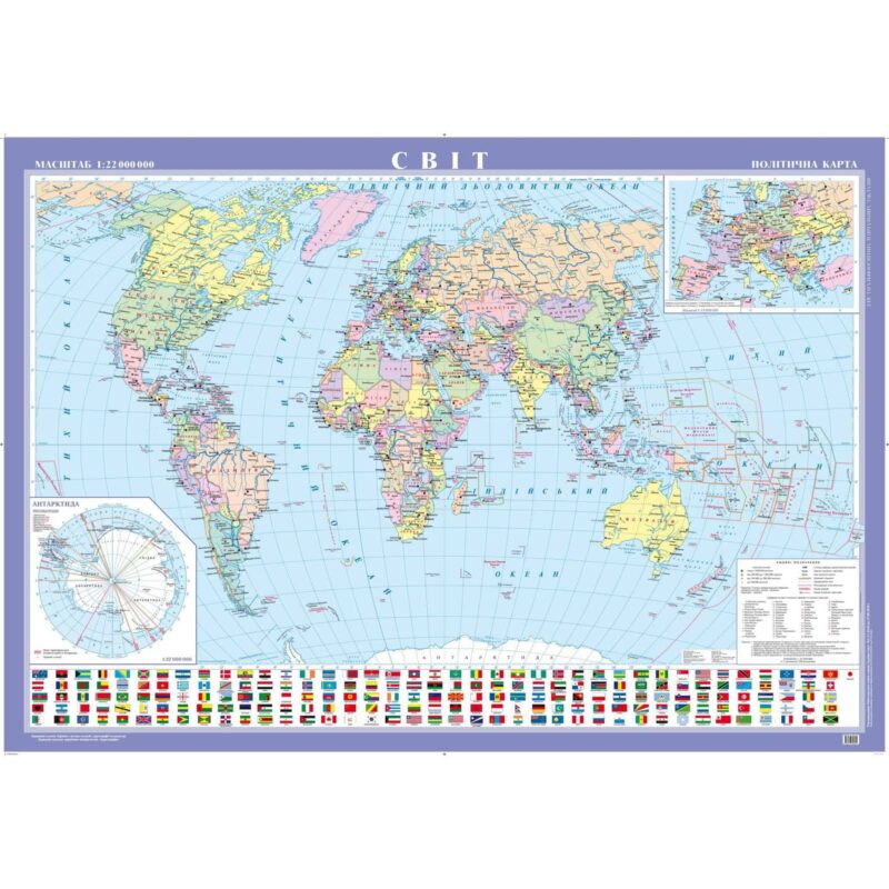 This Ukrainian-language map illustrates the modern political divisions of the world. National capitals, major cities and major waterways included. Inset maps of Antarctica and Europe provide additional detail not visible on the main map.