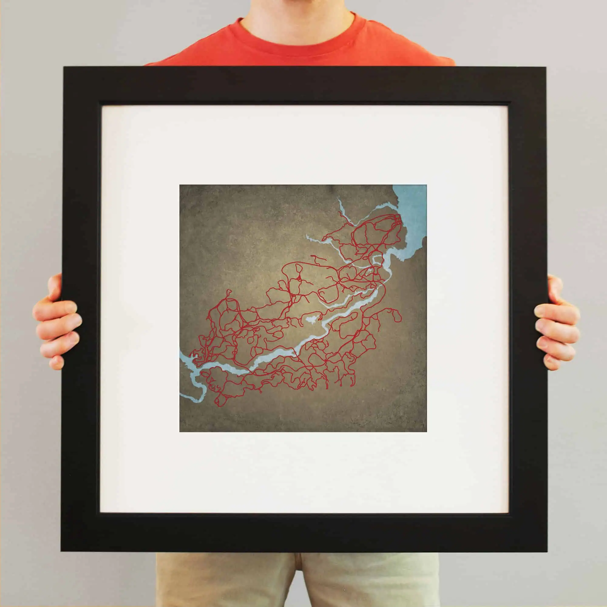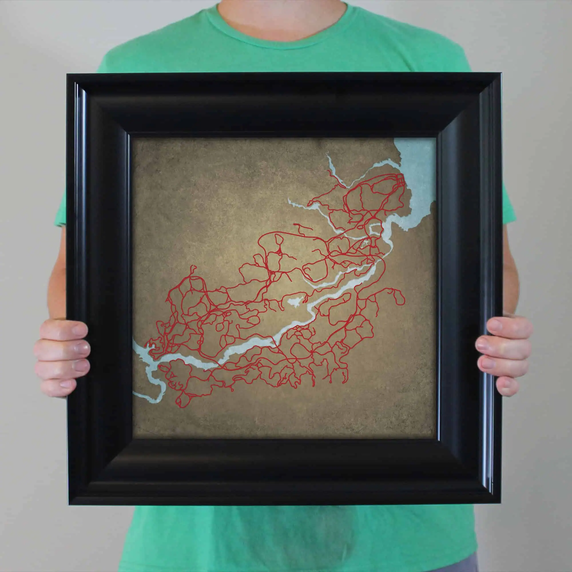 The size of this frame will vary depending on the size of the map you created. Frames are 16.5″ x 16.5″ for 12″ x 12″ prints and frames are 16.5″ x 20.5″ for 12″ x 16″ maps. Our frames have a black 2.75” wide heavy polystyrene molding. We choose to mount the prints without a glass/acrylic overlay, which shows off the unique properties of our paper stock when it hits the light. The back of the frame is sealed with a dust cover for added protection. Industrial silver hanging hardware is fixed to the back of the frame so it’s ready to hang on your wall.