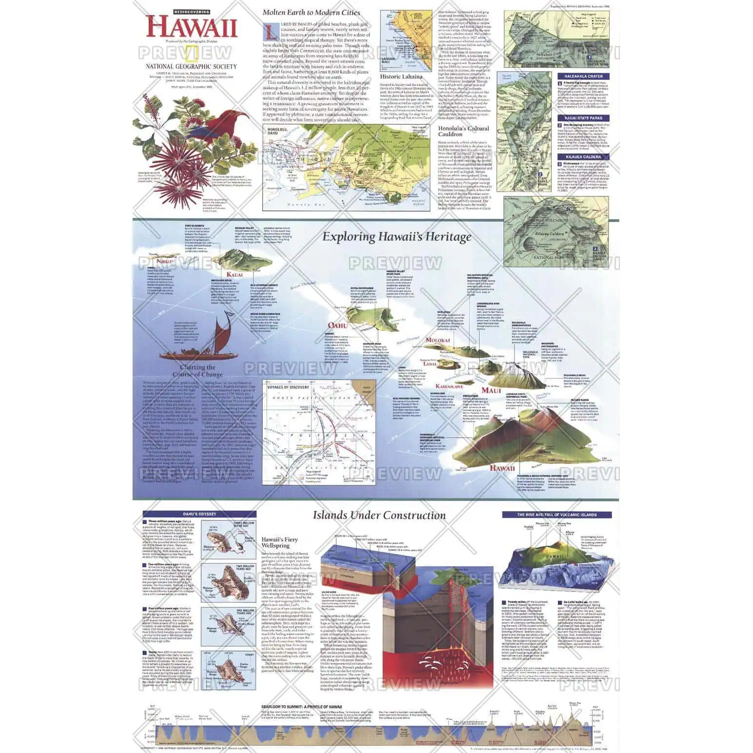 Discover the fascinating islands of Hawaii with this informative map which includes facts about the formation and history of the islands, as well as information about its ethnic and cultural diversity. Published in September 1995 as a companion map for the map of Hawaii printed in the same issue, this work also accompanied the article “On the Brink: Hawaii’s Vanishing Species.”