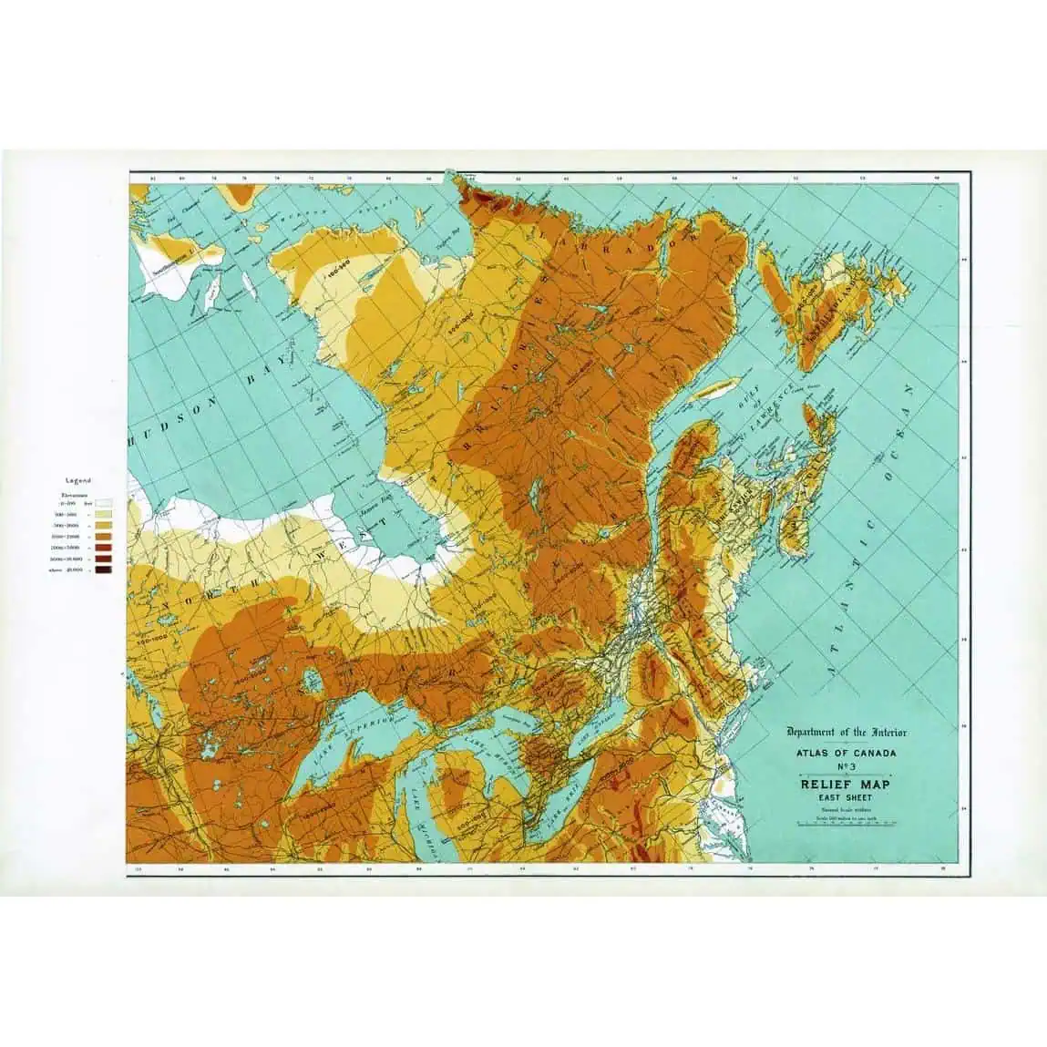 Contained within the 1st Edition (1906) of the Atlas of Canada is a map that shows the relief (in feet) for Eastern Canada. Depth of the elevation is proportional to the varying tints of brown. The highest elevations are shown in the darkest tints and lower portions in lighter tints. Relatively large areas of Western Canada had incomplete data on relief as of 1906. The map also shows major drainage divides and railways. 24 x 17.25 in