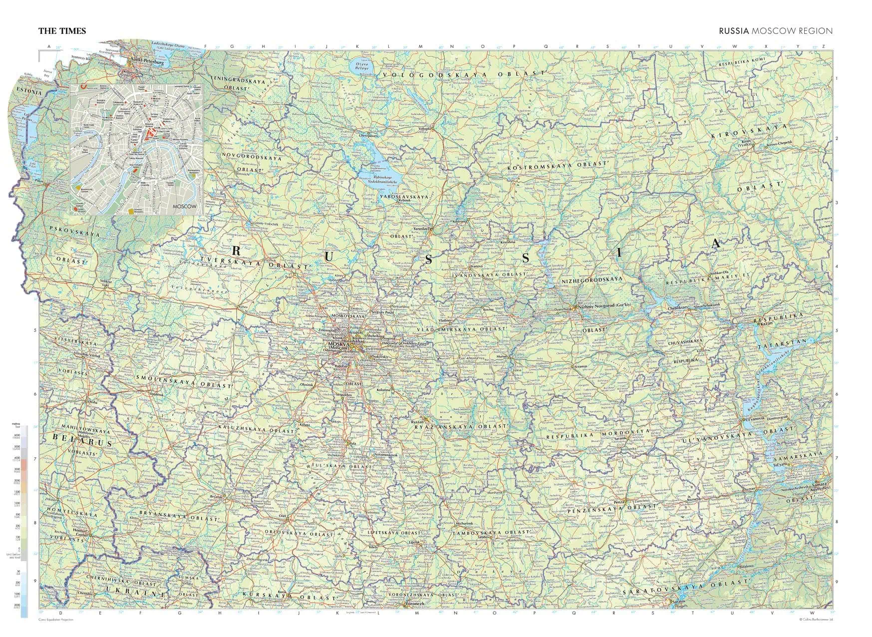 This map of Russia's Moscow Region stands as a benchmark of cartographic excellence, sourced from the industry-leading Times Comprehensive Atlas of the World. Published in full colour, this map offers a comprehensive and updated view of the landscapes that define this region. Notably, this map includes an inset map of Moscow which adds further information about Russia's capital. With meticulous attention to detail, this map is an indispensable guide to the geographic intricacies of Russia's Moscow Region.