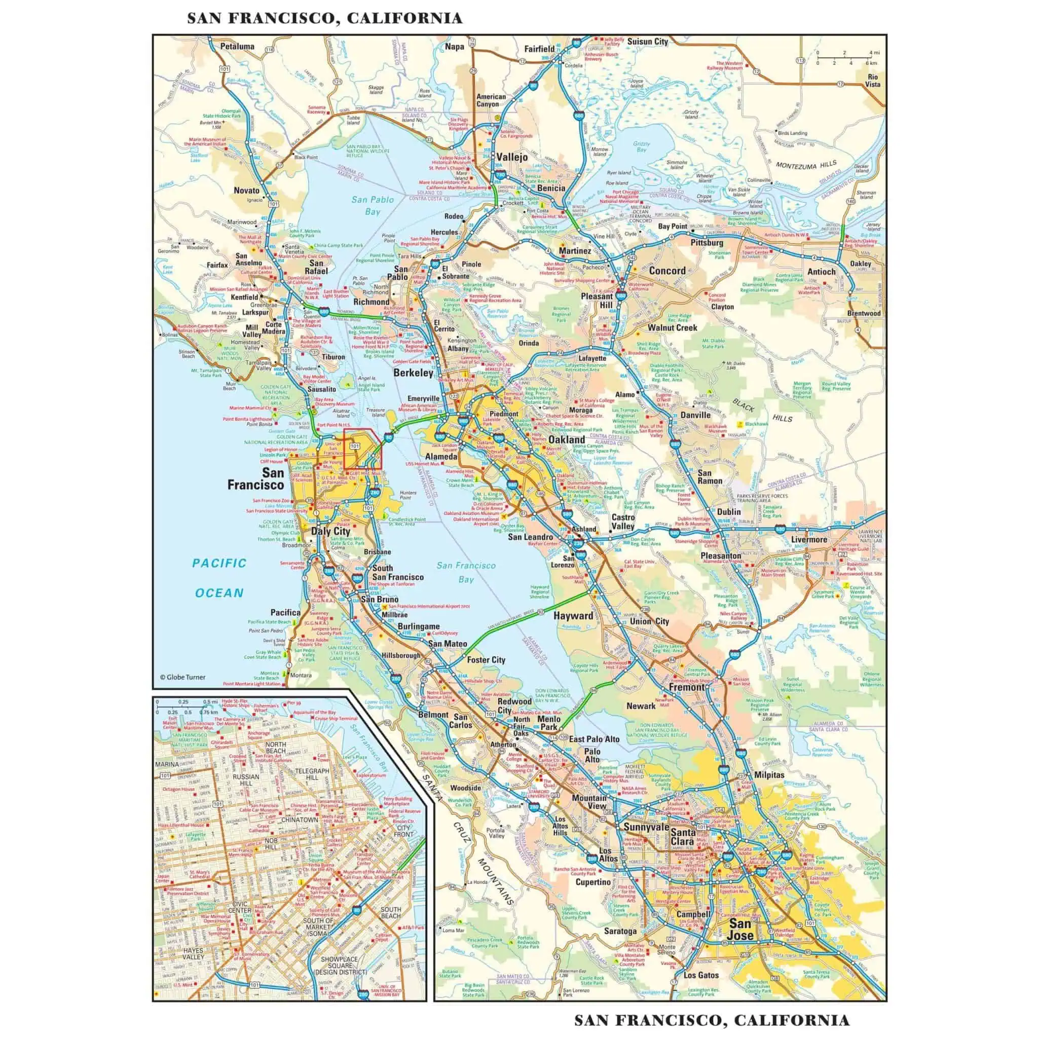 This detailed reference map combines two maps in one – a regional map of the San Francisco Bay area plus a street-level map of downtown San Francisco. The regional map includes the major metropolitan areas of San Francisco, Oakland, and San Jose. The area’s cities and towns, highways and roads, and a variety of points of interest are depicted. The map is beautifully rendered with terrain relief. The inset map of downtown San Francisco shows highways, streets, cable car lines, parks, landmarks, and other points of interest. Chinatown, Telegraph Hill, Nob Hill, and North Beach are among the neighborhoods shown on this map.Â