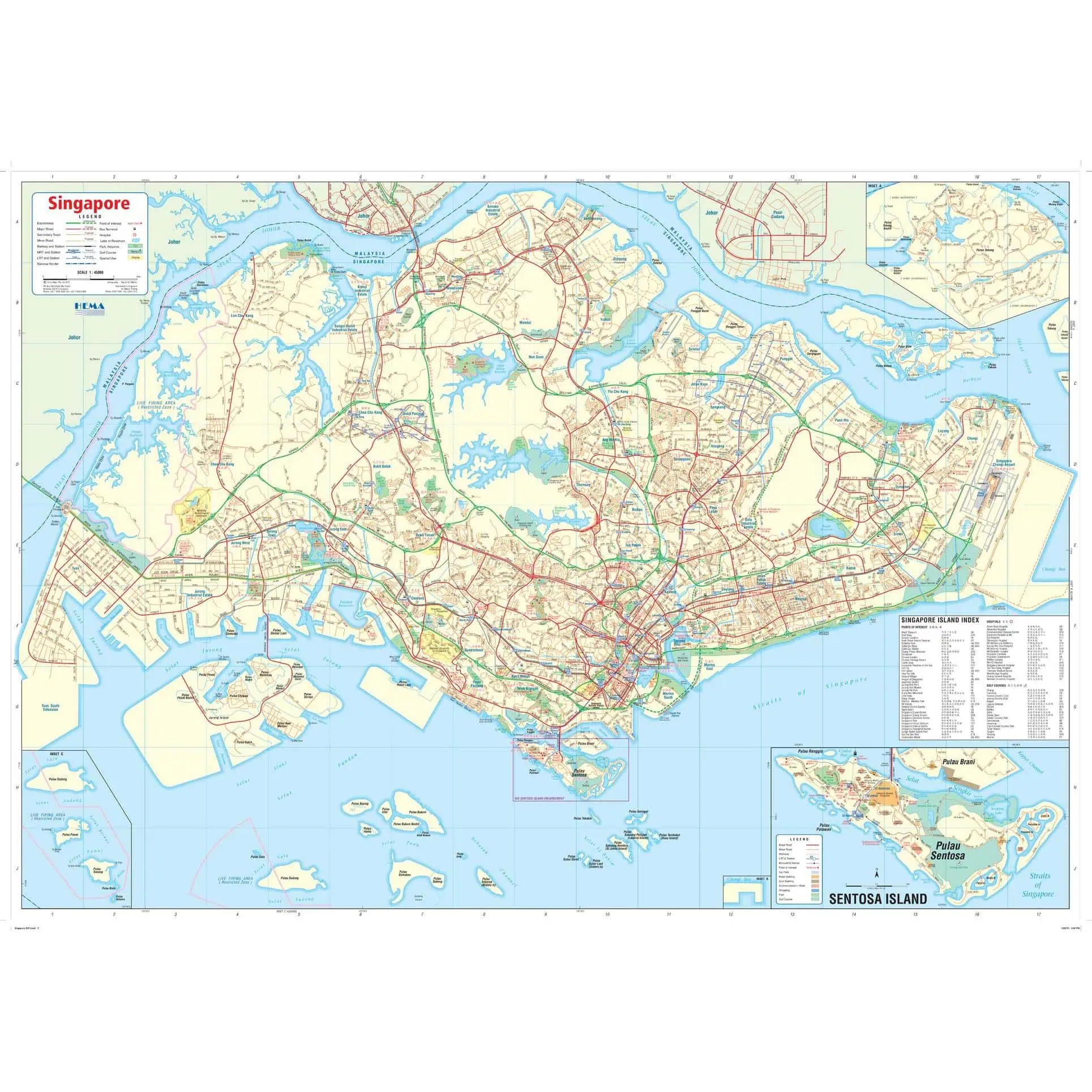 Travel map of Singapore. Distinguished between four levels of roadways and shows both MRT and LRT transit routes. Inner city map shows locations of bus terminals, points of interest, govt buildings, hotels, theaters, shopping centers, churches, hospitals, parks, and estates. Includes a comprehensive index of street names.Â